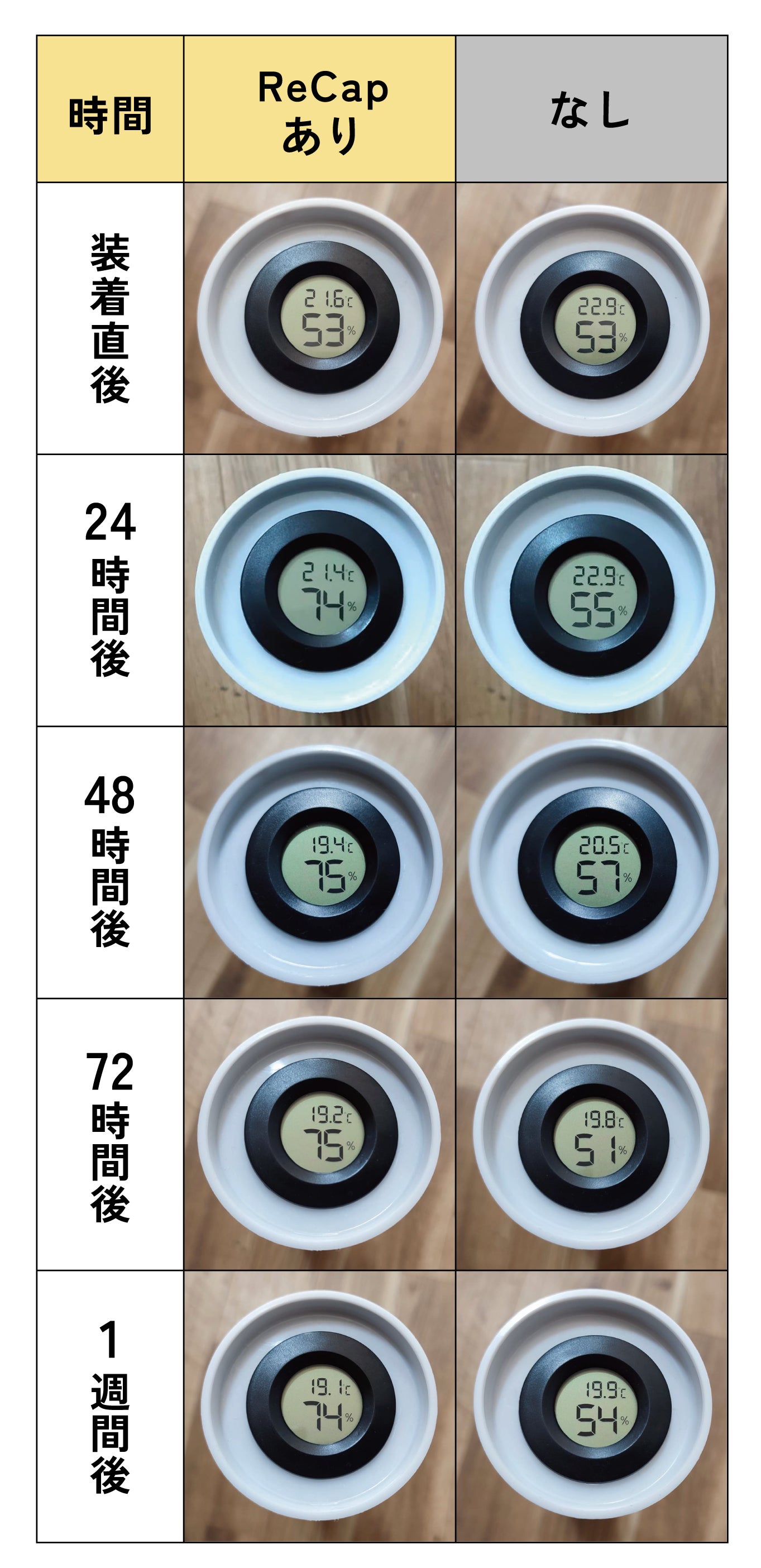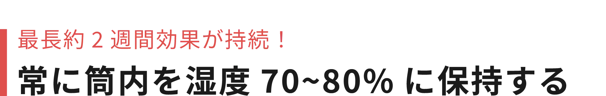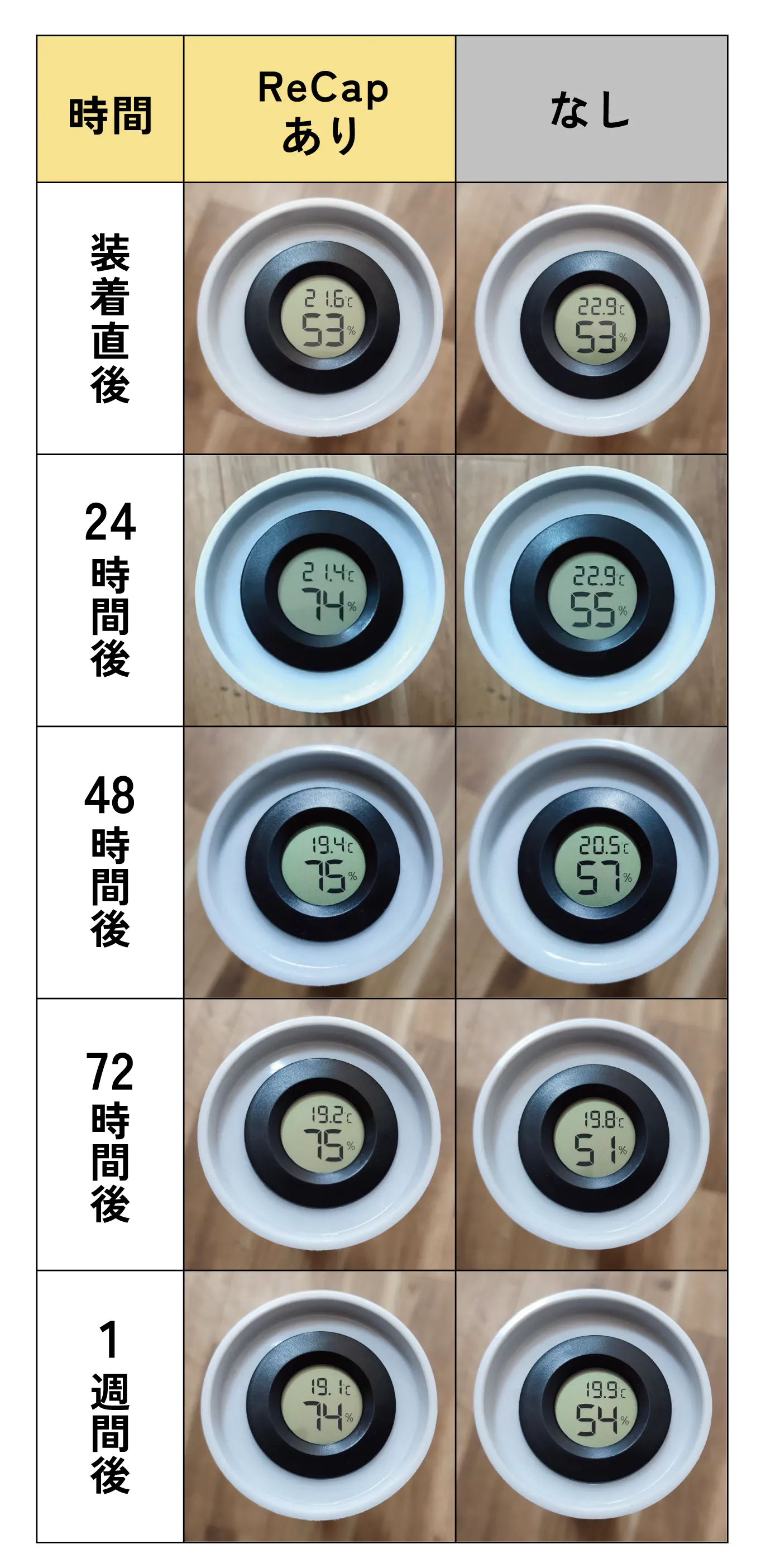 ReCapには、常に筒内の湿度を一定に保持し続けるという効果があります。そしてその効果は最大約2週間持続します。