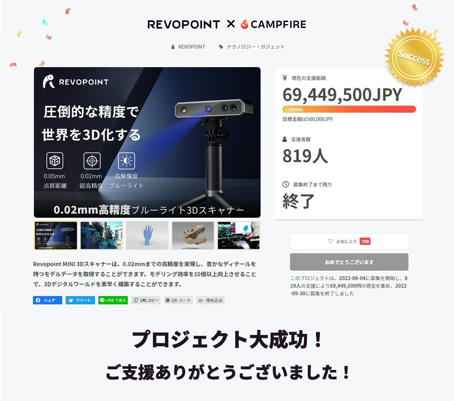 皆様のご支援のおかげで支援者数が819人、募集金額が69,449,500円に達成することができました!