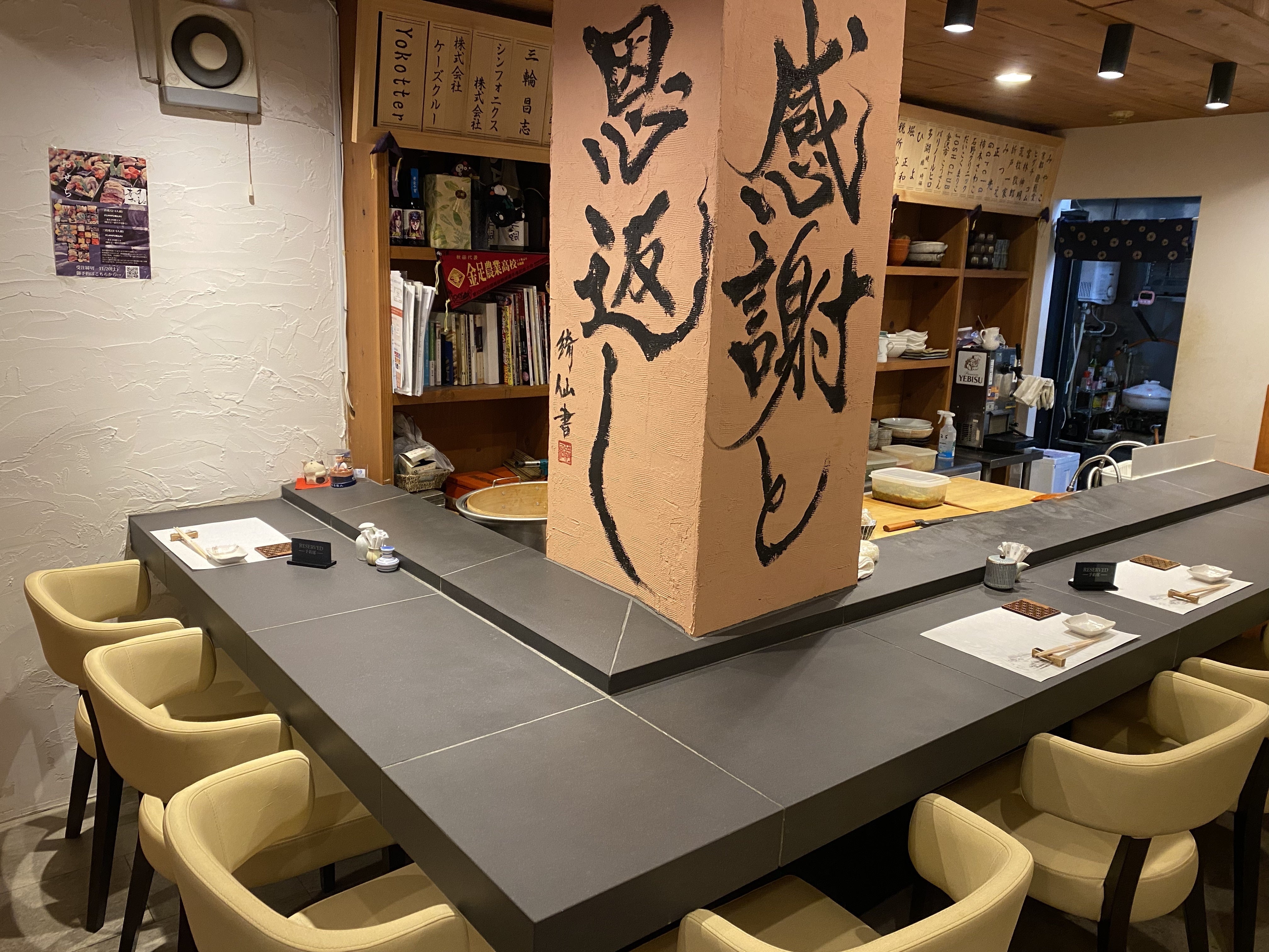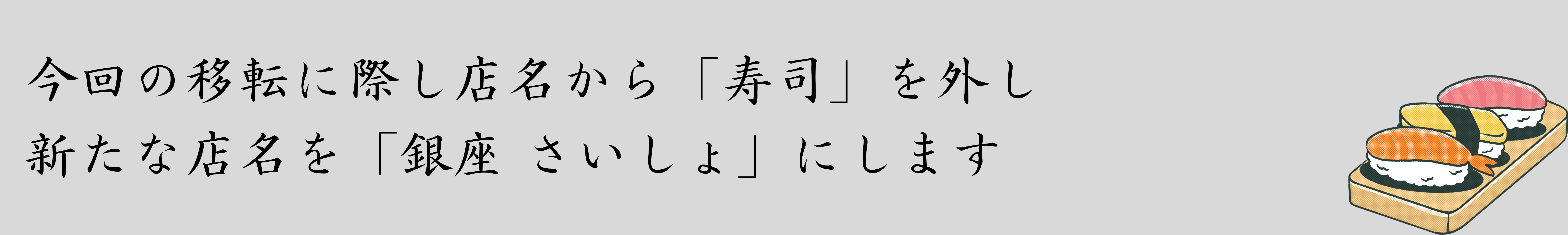 お付き合いの長い方はご存知ですが、ここ大井町での創業時の屋号は「すし処 さいしょ」でした。7年前の銀座移転に際し「寿司 さいしょ」に変更。今回の移転に際し大事な「寿司」の文字を外します。