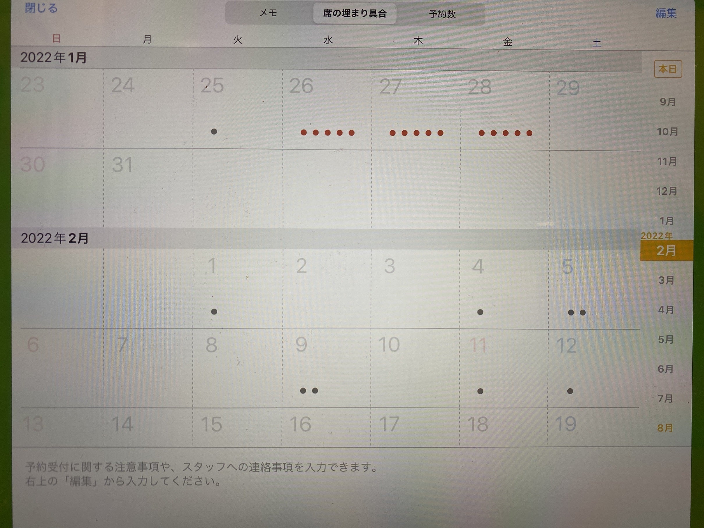 1月~2月の予約状況。点が予約の件数の目安。2月に入るとキャンセルも相次ぎ予約が激減した。 そこで2月頃から利便性の良い大井町駅近く、もしくは銀座に再移転する事を視野に入れ物件を探しながら街の様子を見てきました。徐々にですが街には人が戻りつつあると感じておりました。