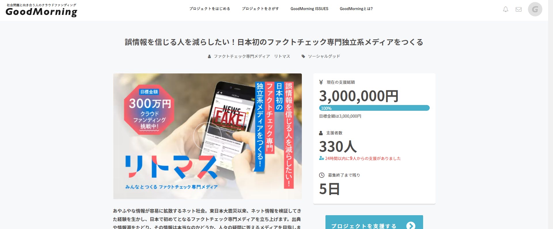本日、クラウドファンディングが、目標額の300万円に到達しました。