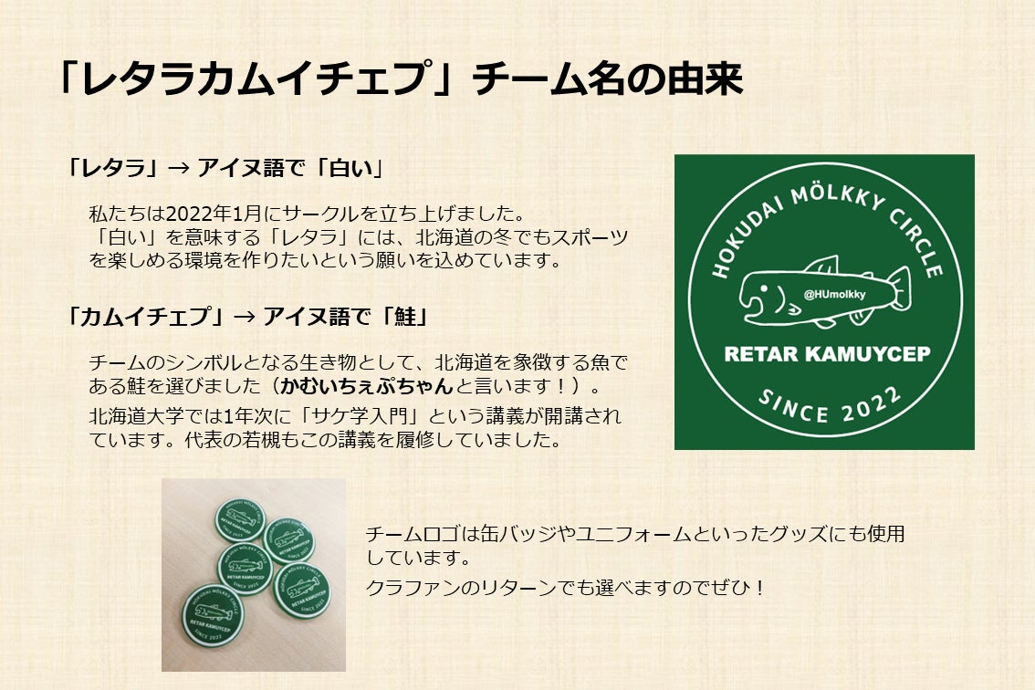 また、地方チームとして、道北には「猿払村モルックサークル チライ」、道東には「清里町モルックサークル イチャヌイ」を設立しました。道南では北海道大学函館キャンパス(水産学部)の「北水モルック同好会」が、レタラカムイチェプ結成前から活動しています。