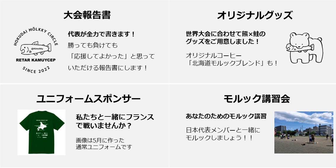 リターンとして大会報告書、オリジナルグッズ、ユニフォームスポンサー、モルック講習会をご用意しています。