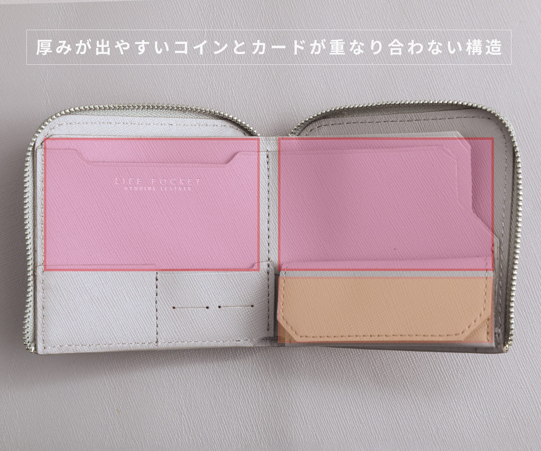 従来のお財布の構造は、硬貨、カード、紙幣、その他の物が重なり合うように設計されています。その為、収納時に厚みが出てしまう物でした。