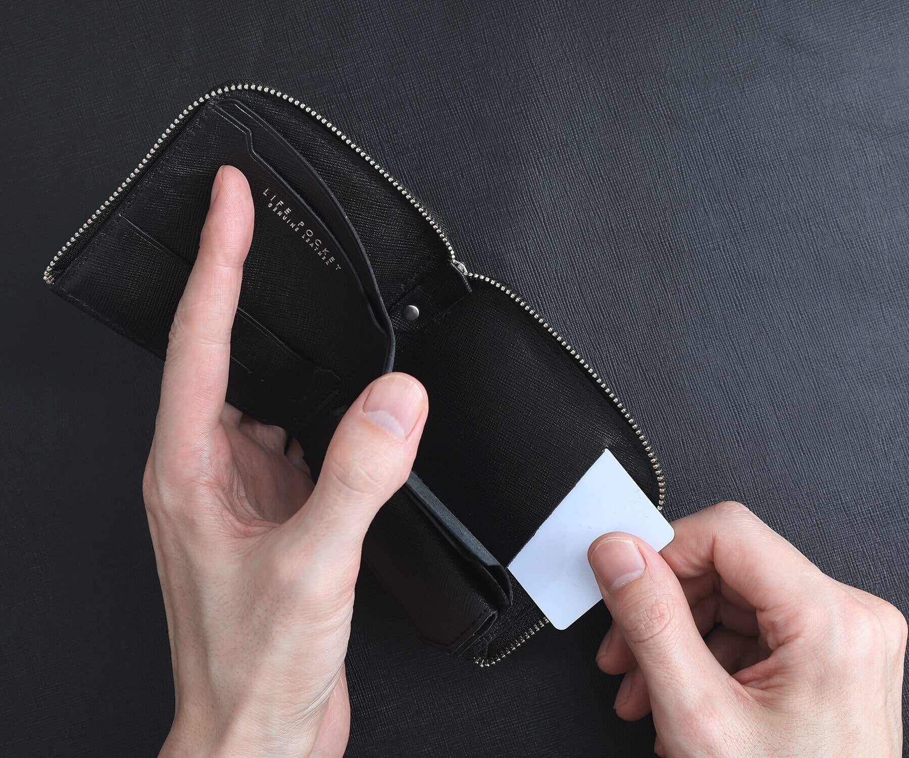LIFE POCKET専用のオリジナルレザーは、一流の職人に直接オーダーをしています。Smart Wallet2 SAFFIANOでは、シャープな印象をさらに引きたてる上品なサフィアーノレザーのみで仕上げてました。