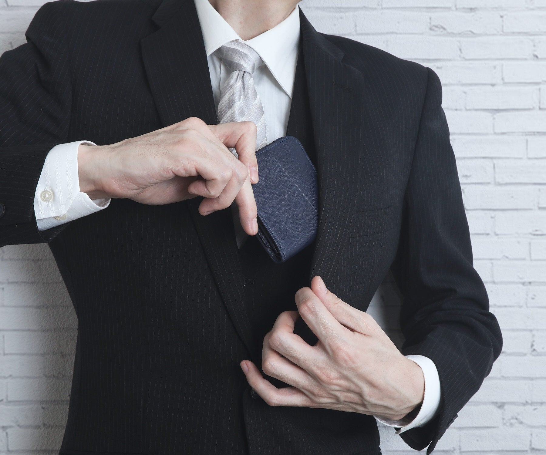 ジャケットの胸ポケットにもすっぽり収まるサイズ感です。ドレスコードがある場面でも、バッグなど持たずに、手ぶらで快適に過ごせます。