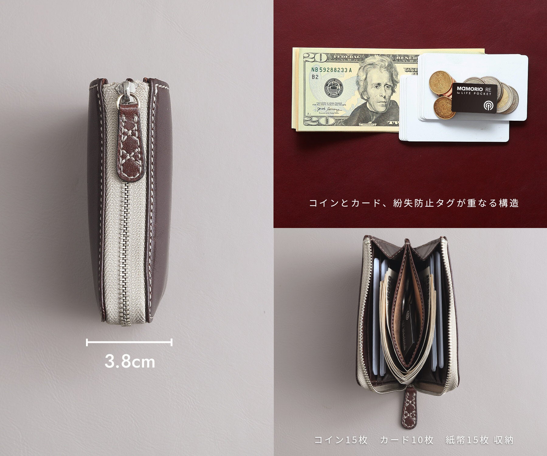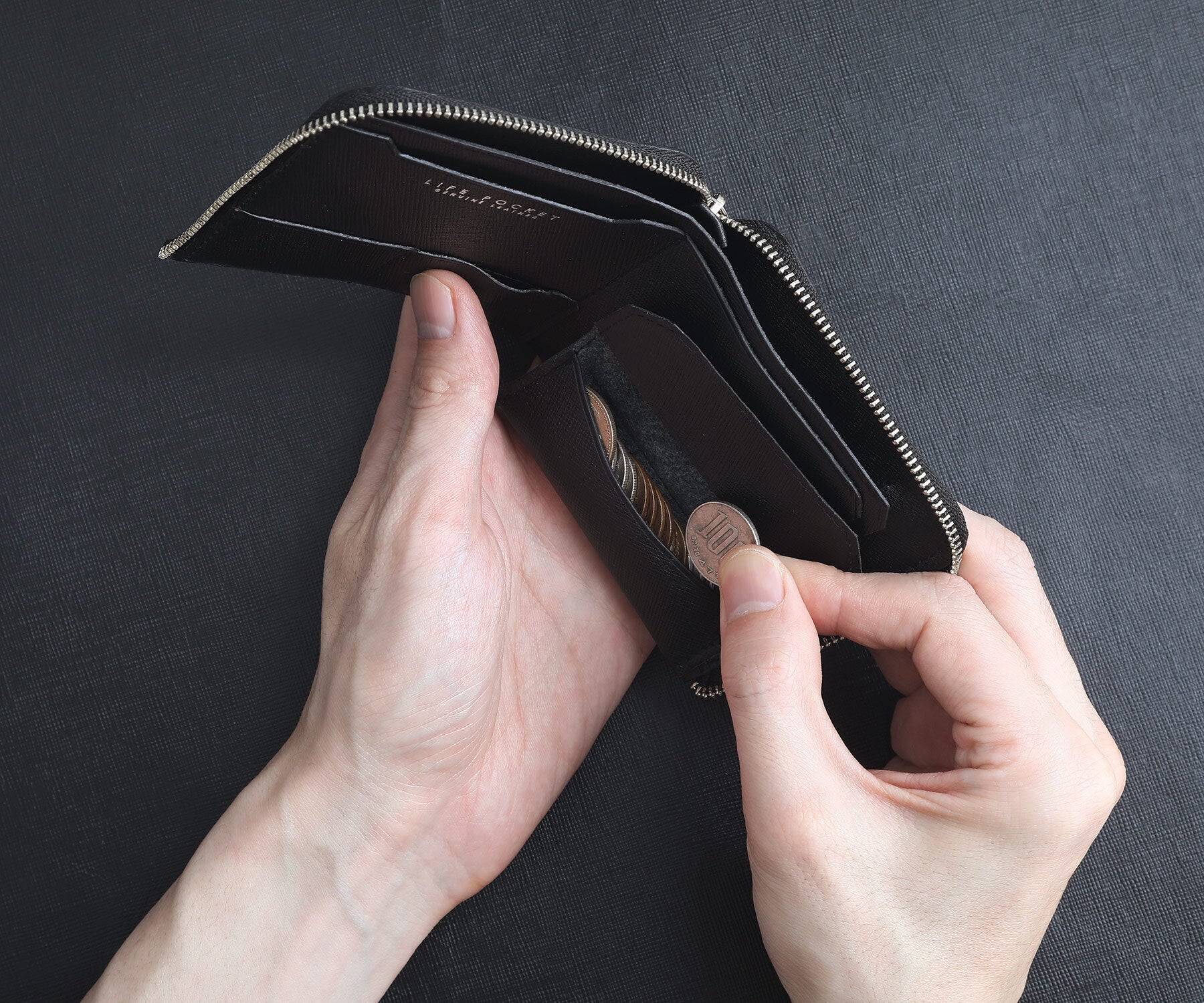 コインポケットが深いと、硬貨を探すのも取り出すのもスムーズにできません。しかし、浅く大きく開くコインポケットなら必要な硬貨をすぐに見つけて取り出せます。ファスナーを閉じれば、コインがこぼれる心配はありません。
