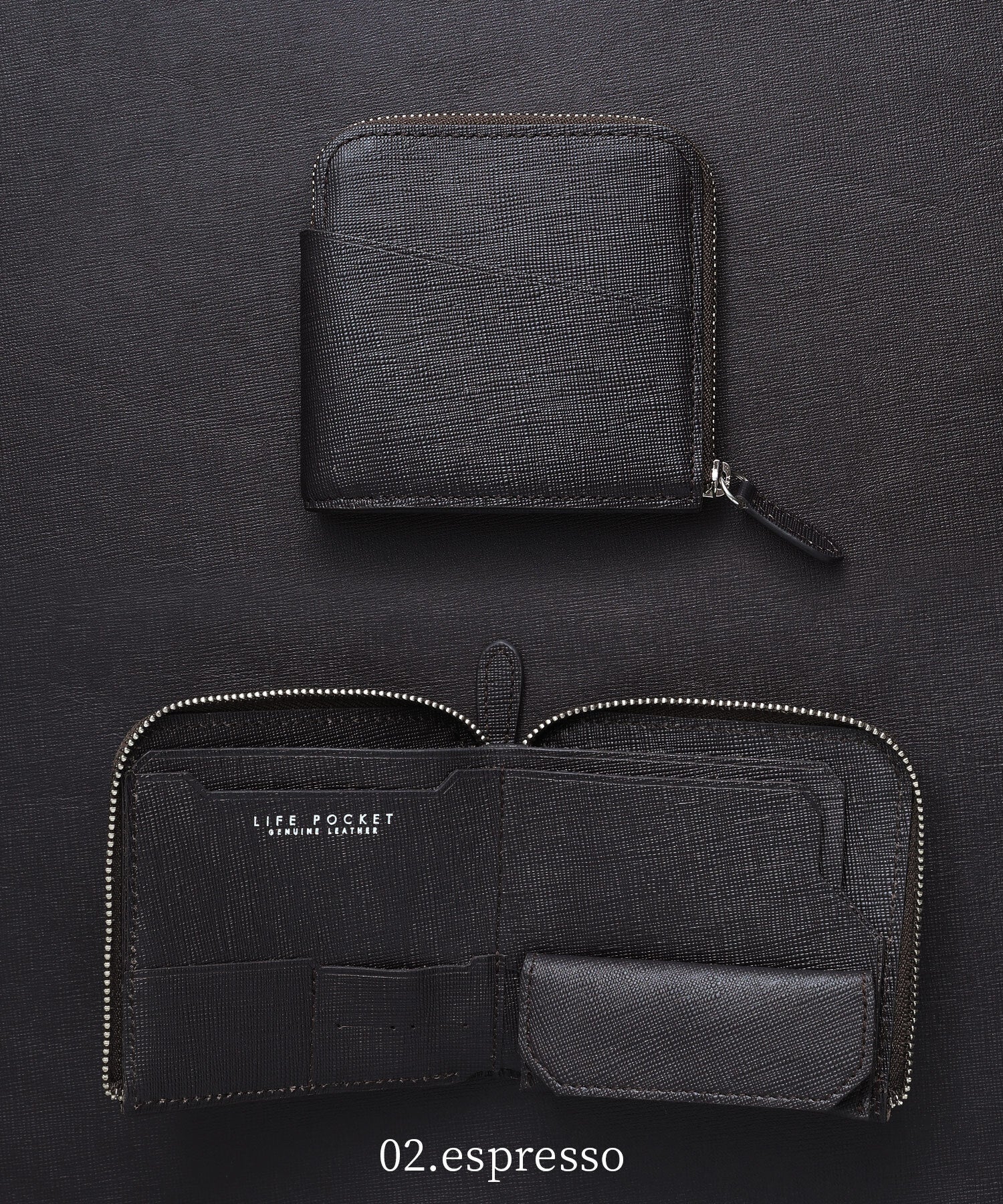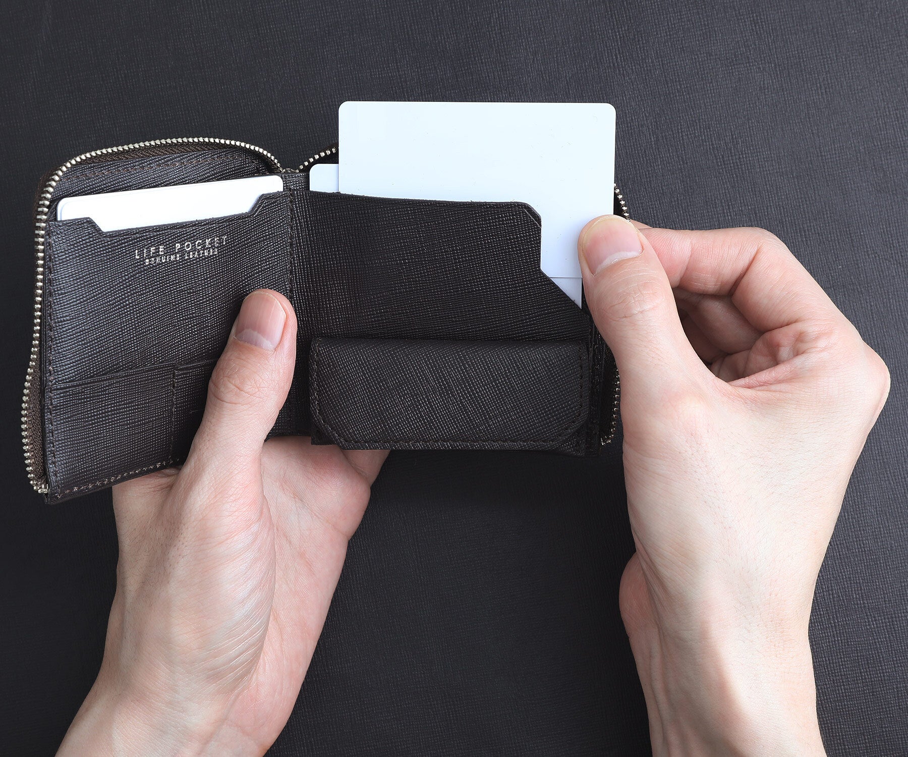 LIFE POCKET専用のオリジナルレザーは、一流の職人に直接オーダーをしています。Smart Wallet2 SAFFIANOでは、シャープな印象をさらに引きたてる上品なサフィアーノレザーのみで仕上げてました。