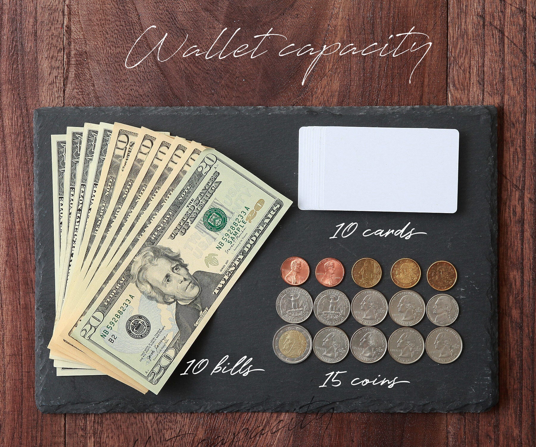 快適にご利用いただける最大容量は硬貨15枚、カード10枚、紙幣10枚。
