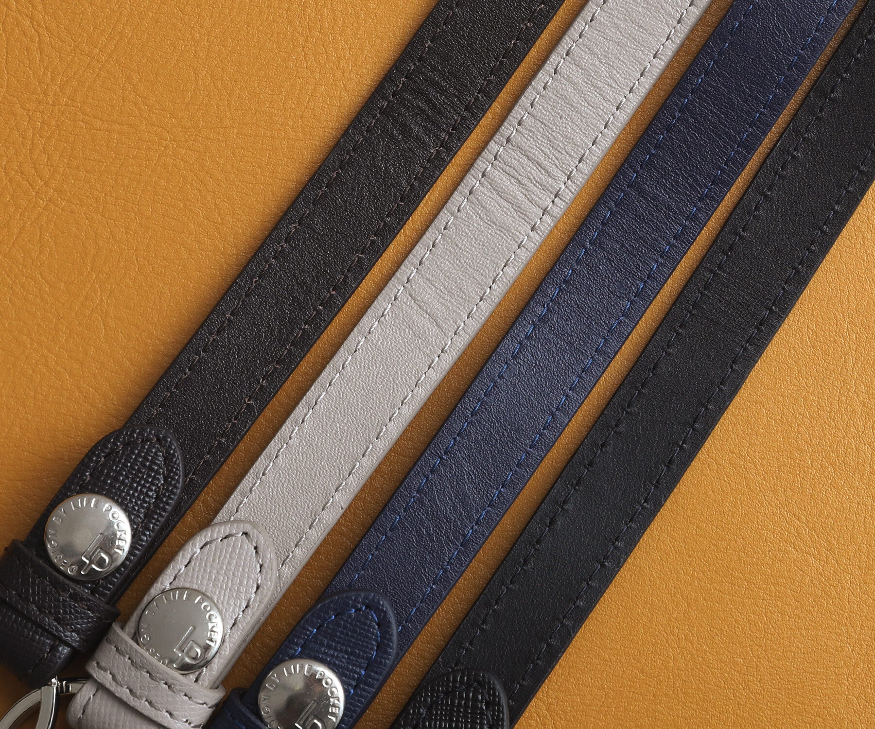フォブループの留め具は取り外しがしやすいようにスナップボタンを使用しました。 ベルトを取らずに、簡単に繋ぐ事ができます。