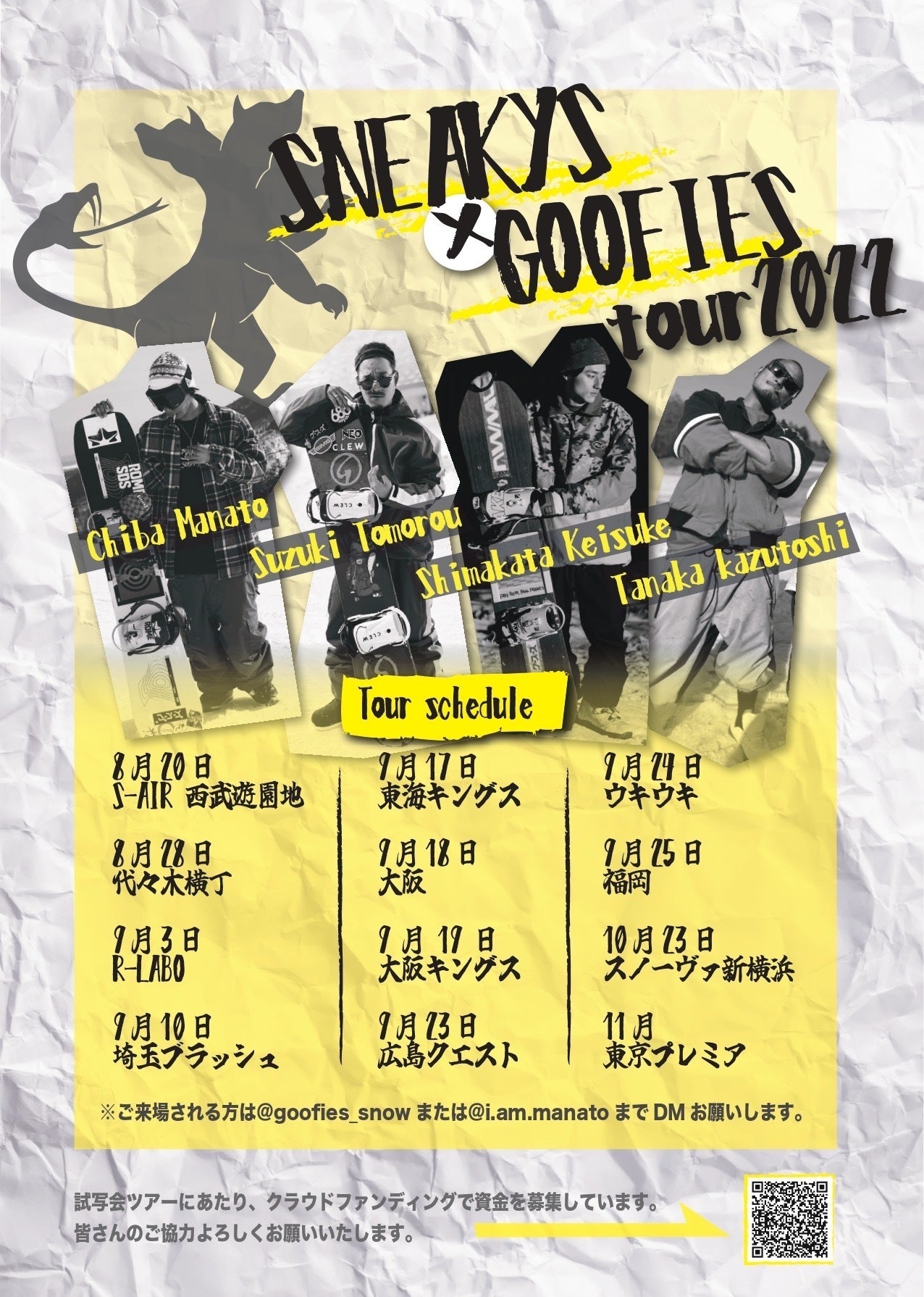 2022/08/10 21:25クラウドファンディングページにて記載されている各会場のスケジュールで一部変更がありますのでこちらに記載させていただきます。▼日程(2022年8月〜11月)8月20日(土)※訂正S-AIR(埼玉県 西武遊園内ウォータージャンプ施設)イベント、BBQ、試写会8月28日(日)※追加代々木横丁(居酒屋) 試写会9月3日(土)R-LABO(群馬県 SUP施設)SUP、試写会9月10日(土)埼玉BRUSH (埼玉県 屋外スノーボード施設) イベント、試写会9月17日(土)東海キングス (愛知県 屋外スノーボード施設)イベント、試写会9月18日(日)大阪 W STATION(BAR) 試写会9月19日(月)大阪キングス(大阪府 屋外スノーボード施設)イベント、試写会9月23日(金)広島クエスト(広島県 屋外スノーボード施設)イベント、試写会9月24日(土)※変更ウキウキパーク (熊本県 屋外スノーボード、スケートボード施設) イベント、試写会9月25日(日) ※変更TENJIN DINING MIST (福岡県 バー) 試写会10月23日(日) スノーヴァ新横浜 (神奈川県 室内スノーボード施設) イベント、試写会11月予定東京 場所未定 (当日別イベントSNOWBANK PAY IT FOWARDのアフターパーティーでの開催予定。ツアーイベント最終試写会。) もっと見るグーフィーズ鈴木智郎 のサポートブランド表記ミスについて