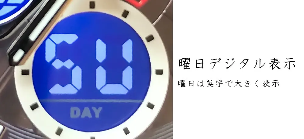 ・機能 バックライト、カレンダー、防水3気圧、ストップウォッチ、アラーム、チャイム