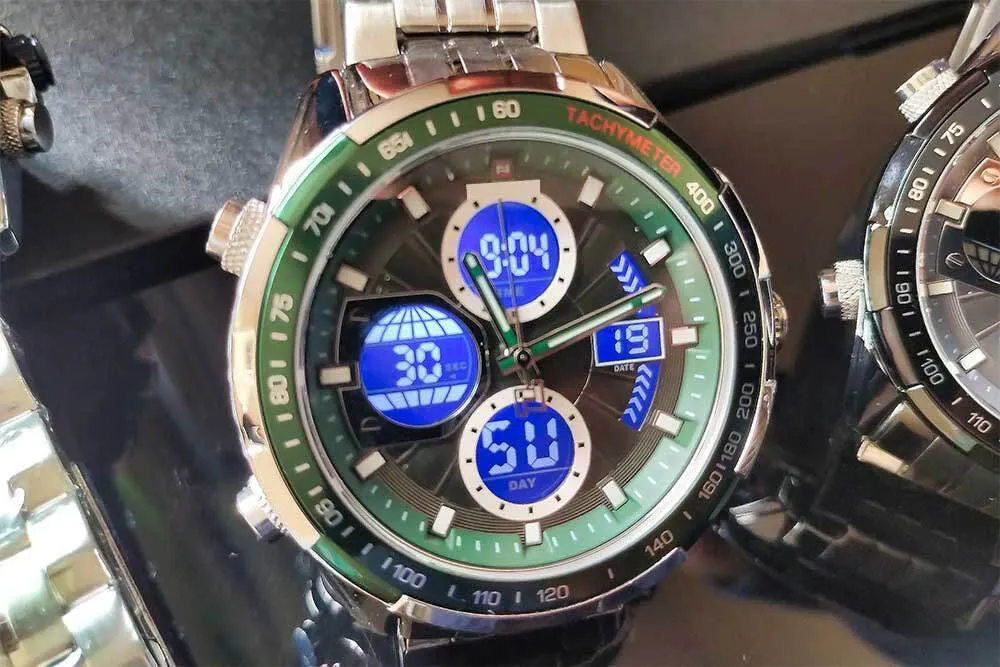 クロノグラフは勿論、カレンダー、LEDバックライト、アラーム、チャイム、防水機能を搭載。