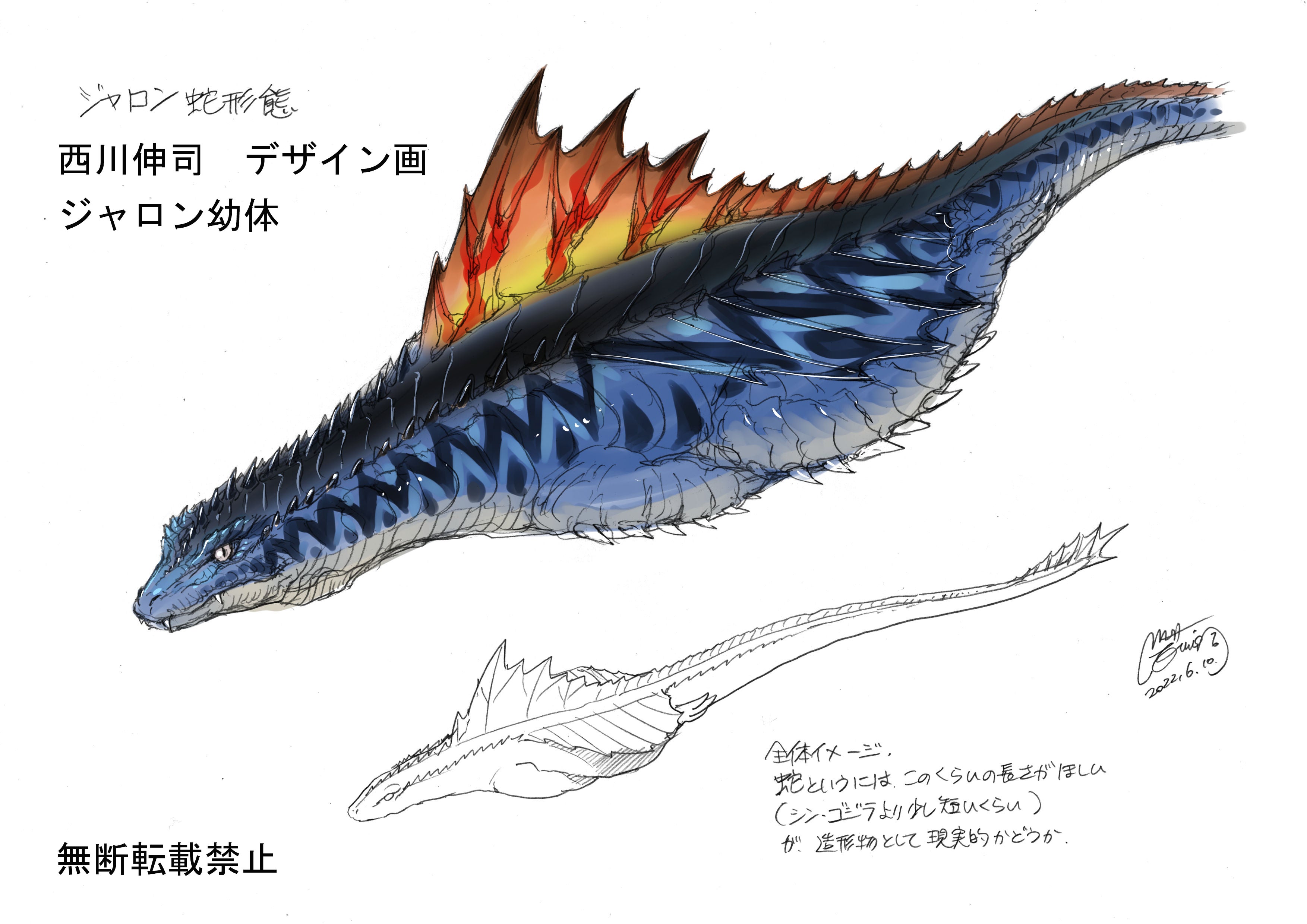 氏とは竹之内氏に紹介され、初めて我が家にて初の怪獣デザインの打ち合わせ。デザインそっちのけで怪獣談義に花が咲き、まるでトークショーのようで怪獣ファンがいたら涙もの。監督の僕が色々な希望を告げて西川氏がスラスラと描くデザインは凄いの一言に尽きる。後日送られてきたデータ画像は順次公開予定。