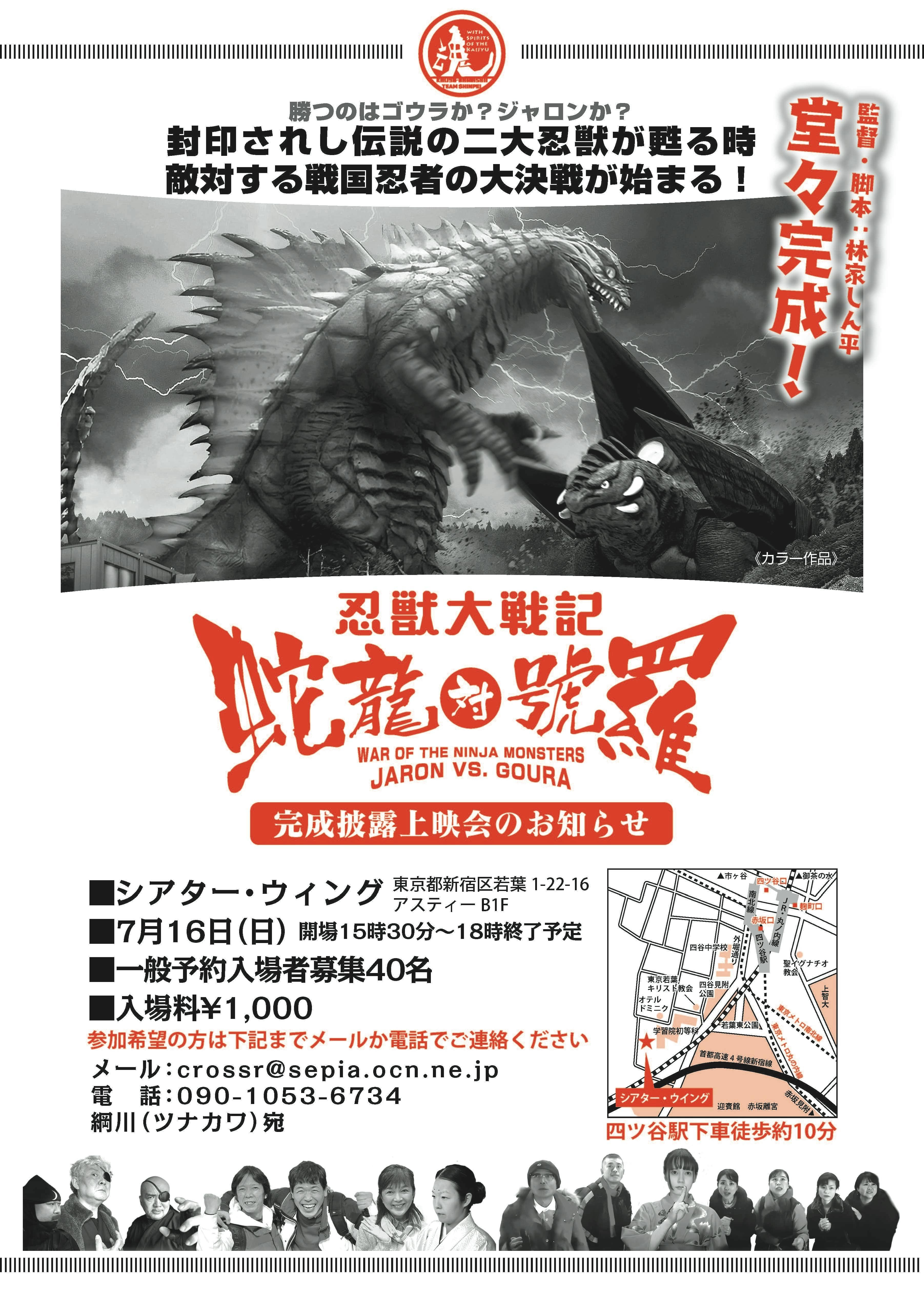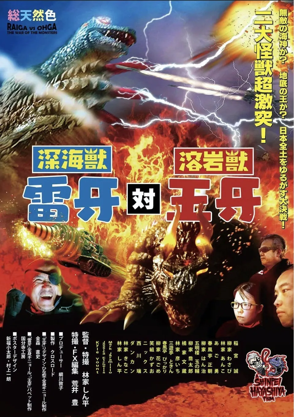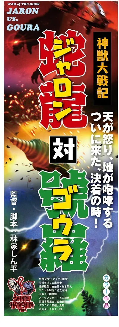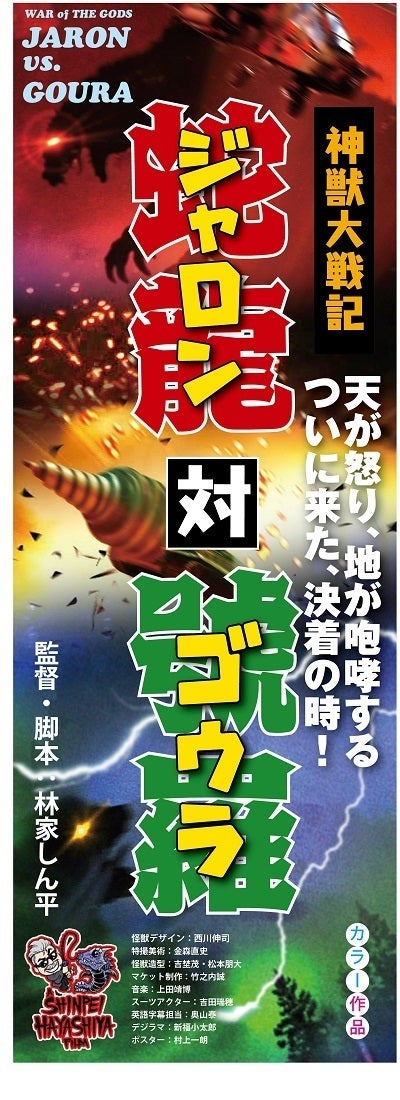 『神獣大戦記ジャロン対ゴウラ』 この作品は林家しん平のオリジナル怪獣映画になります。思えば、怪獣映画、特撮映画を愛し、いつしか観る方から撮る方になっていました。特撮業界の先輩たちに協力を仰ぎ、夢を形にしてきましたが、66歳になり色々なものを断捨離することに決め、怪獣コレクションや特撮系グッズなど涙を飲んで売り渡しこの映画に投入いたしました。しかし怪獣ファンを辞めるわけではありません。むしろ気持ちは強くなることでしょう。次の怪獣ファンの中から私のような人が現れ夢を見せてくれることを願ってやみません。 林家しん平