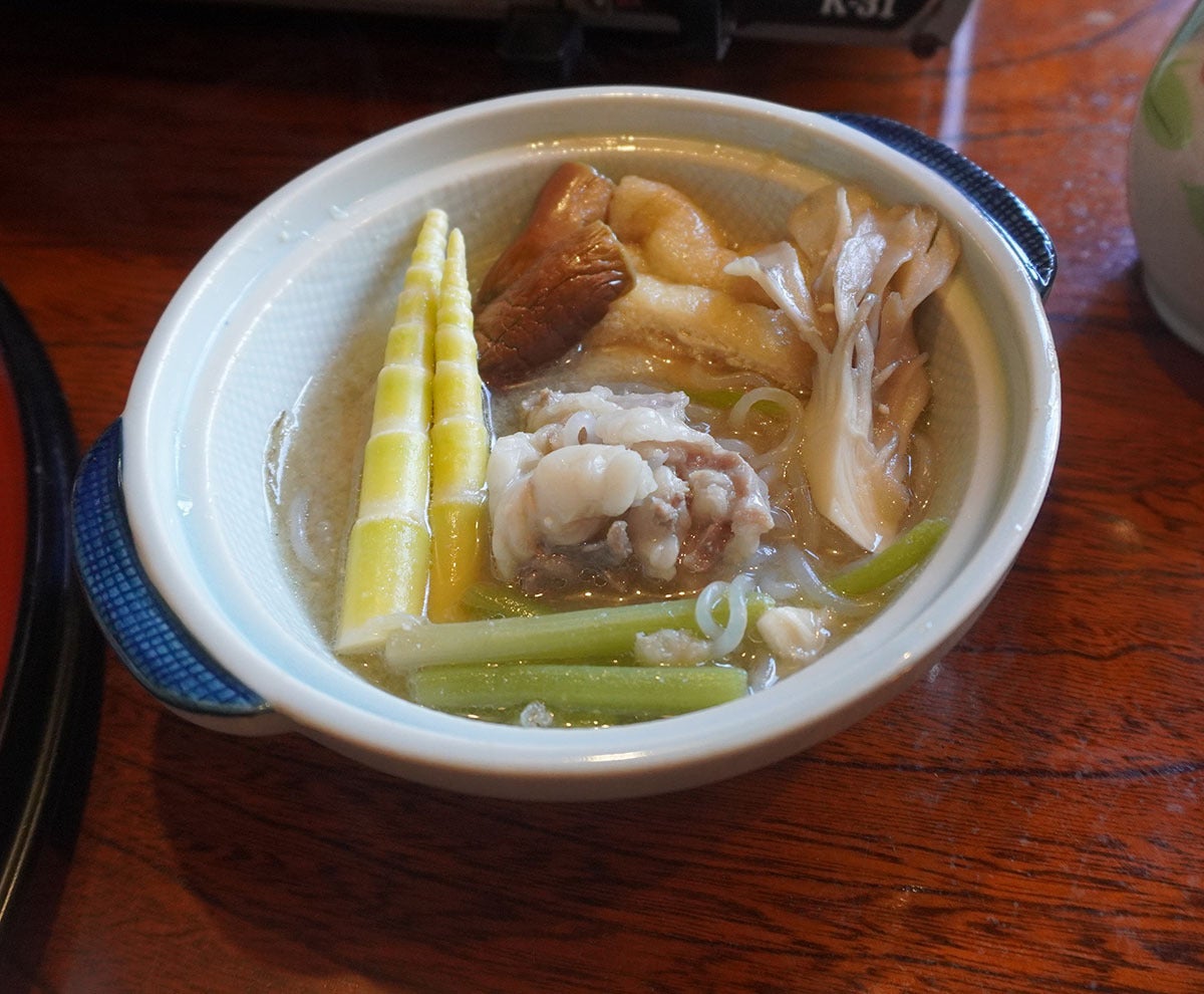秋田県大仙市ちゃんす長野屋さんで提供される、日の丸鍋(うさぎ肉を使った伝統的な味噌味の鍋物)