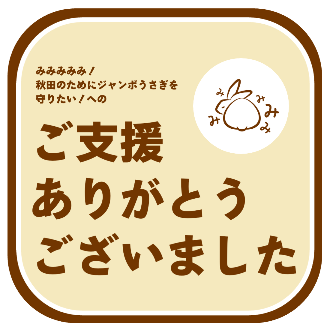 2022/09/02 15:49みみみみみ!秋田のためにジャンボうさぎを守りたい!にご支援くださった皆様へこの度は温かいご支援を誠にありがとうございました。目標金額を達成することはできませんでしたが、こんなにも多くの方がジャンボうさぎのことを知ってくださり、ジャンボうさぎを守るためにご支援くださったことが、とても嬉しく、励みになります。重ねて御礼申し上げます。リターンにつきましては、順次発送してまいりますので今しばらくお待ちください。今後も、「秋田のためにジャンボうさぎを守る」を目標に、精進してまいります! もっと見る
