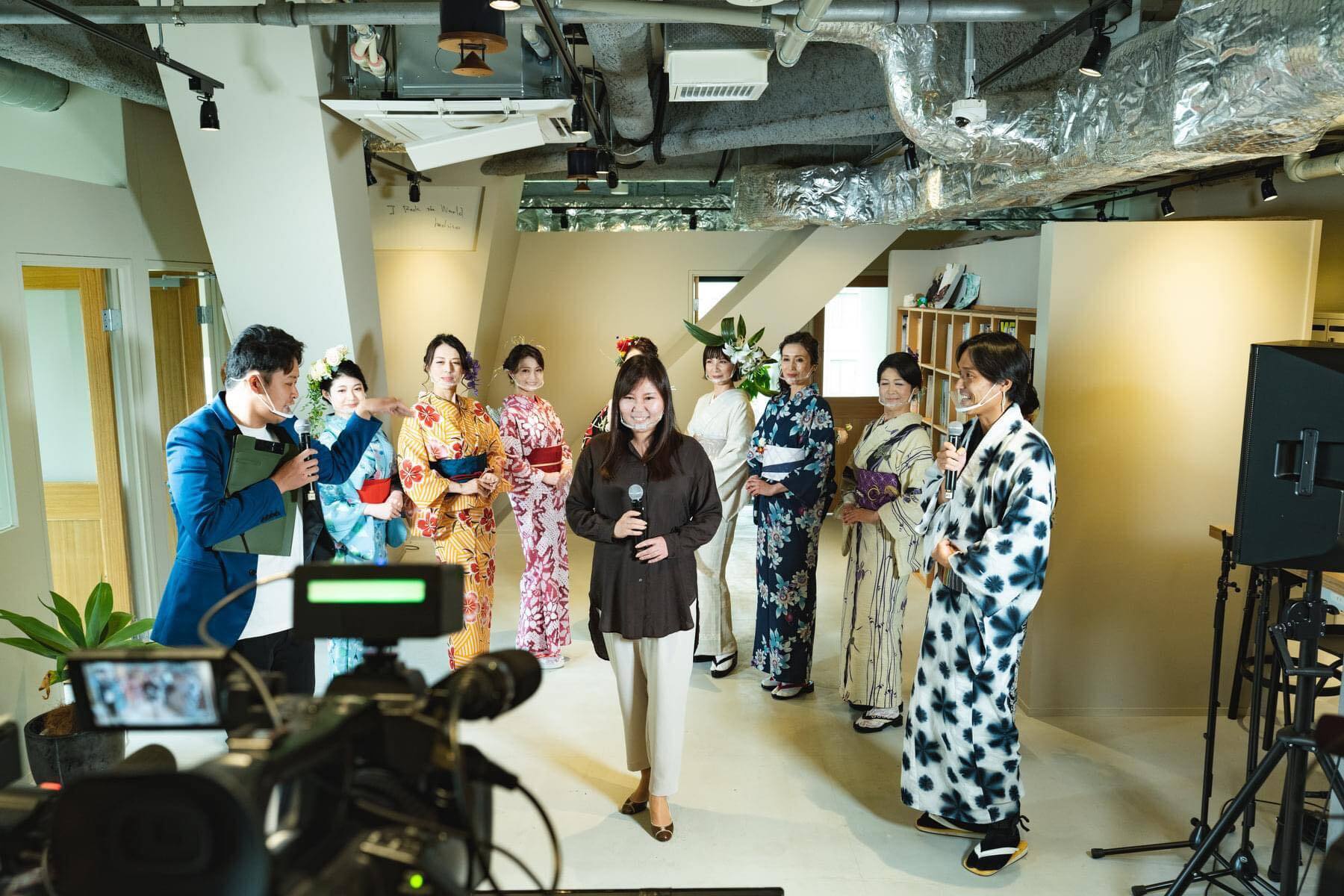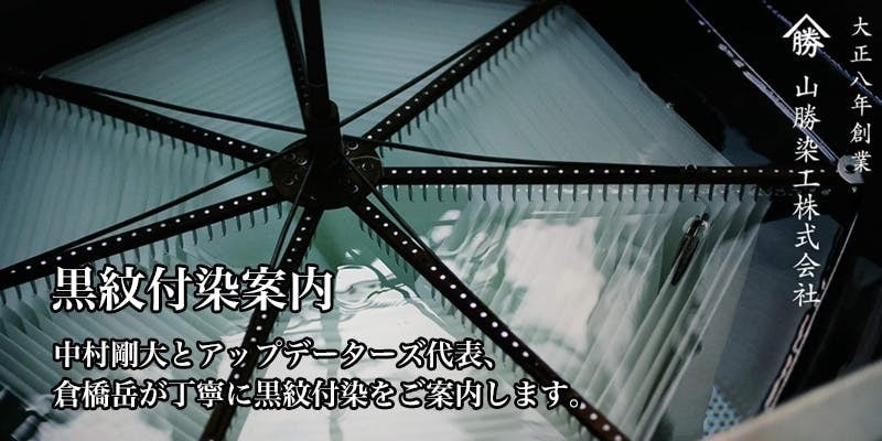 伝統工芸品である黒紋付染を手掛ける職人によるアイテムを取り扱っている中村商店の店主と倉橋岳が丁寧に黒紋付染を工場などにて案内してくれます。