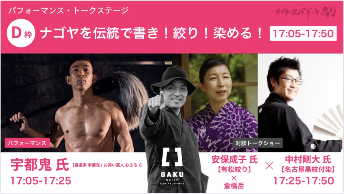 出演予定:大村秀章(愛知県知事)、青木裕典(味噌煮込みうどん大久手山本屋4代目)、高橋雅大(若鯱家)、トキくん(冒険活動キッズ)、中村剛大(名古屋黒紋付染)、安保成子(有松絞り) 等(敬称略)