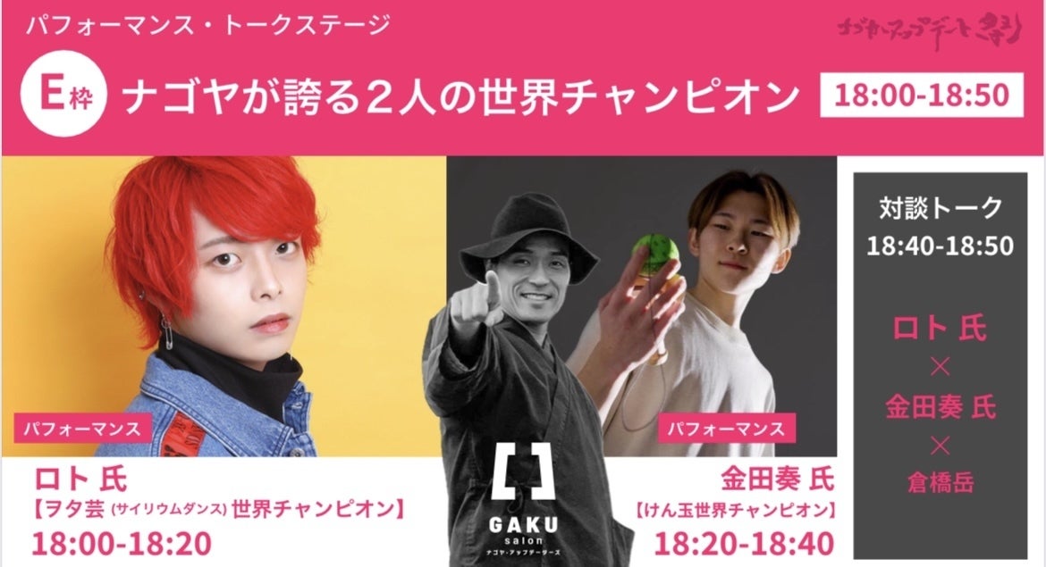 2022/12/17 09:39ステージチケットE枠は【ナゴヤが誇る2人の世界チャンピオン】ヲタ芸世界チャンピオン ロト氏、ストリートけん玉王者金田奏氏お二人の世界チャンピオンのパフォーマンスと対談トークです。オリジナル技、[ロトの紋章]で全世界のヲタ芸プレイヤーから知られる存在のロト氏、Kendama World Cup 2017年大会で、史上初の日本人チャンピオンに輝いた金田奏氏、世界チャンピオンの技を目の前で見られるチャンスなかなかありません!対談トークもありますので、ぜひ会場でご覧になってください!他にもこんな素敵なステージ用意しています。 もっと見る