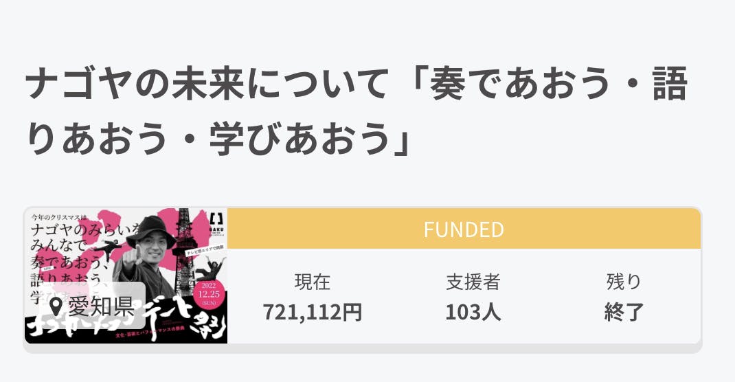 イベント“ナゴヤの未来について「奏であおう・語りあおう・学びあおう」”を開催する為、この度は107名の支援者そして721,112円という大きな支援を頂き誠に感謝をしております!