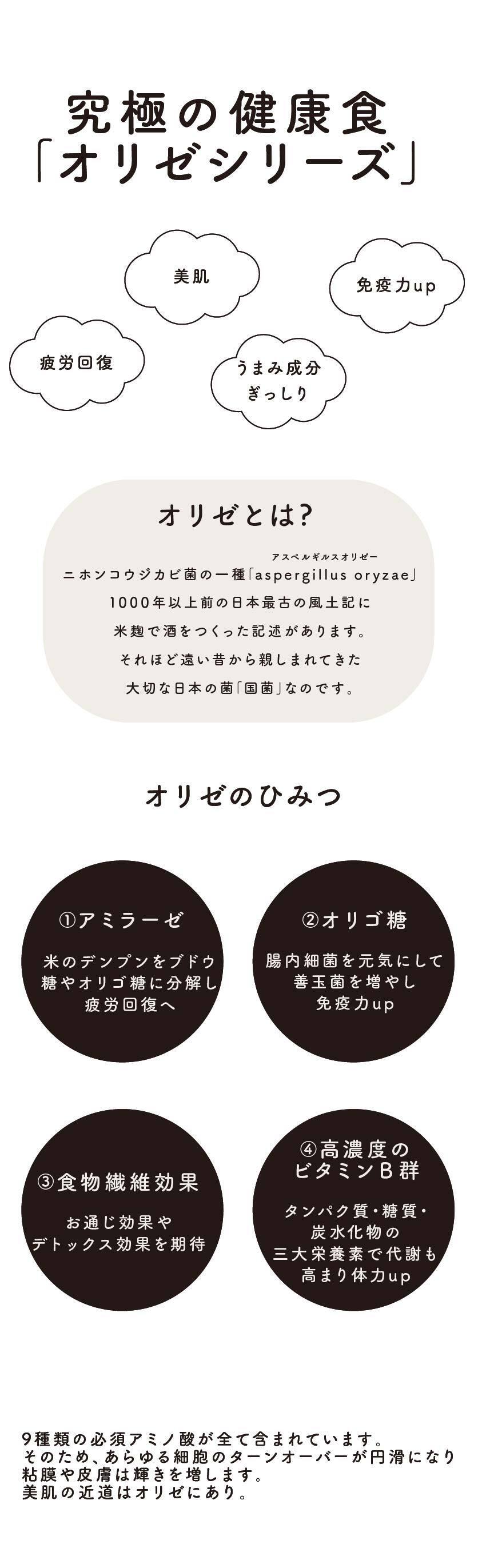この活動の中で「健康にも配慮した食選び」だけではなく、並行して「腸内環境を整えると、あなたは健康」という視点も必須 と感じ、そのために有効な発酵食品オリゼシリーズを開発しました。
