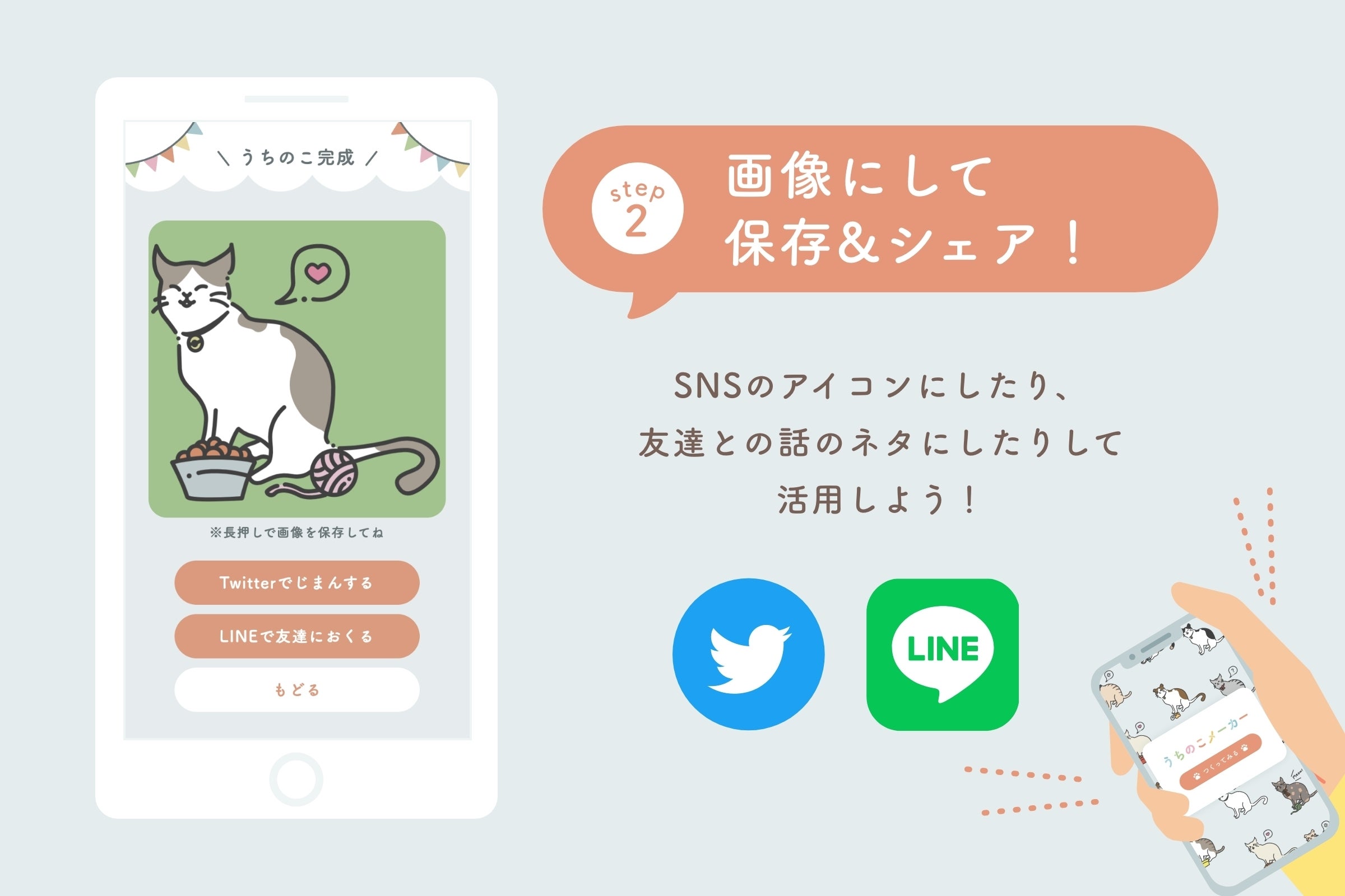 作成した画像は保存できるだけでなく、SNSに投稿することができます。「帰省できず会えていない」、「街中で見かけて気になっている」、「いつか飼ってみたい」そんな猫に対する想いを形にすることができます。SNSのアイコンにしたり、家族や友人へのメッセージに添えたり、ステッカーにしてプレゼントするなど使い方は様々です。