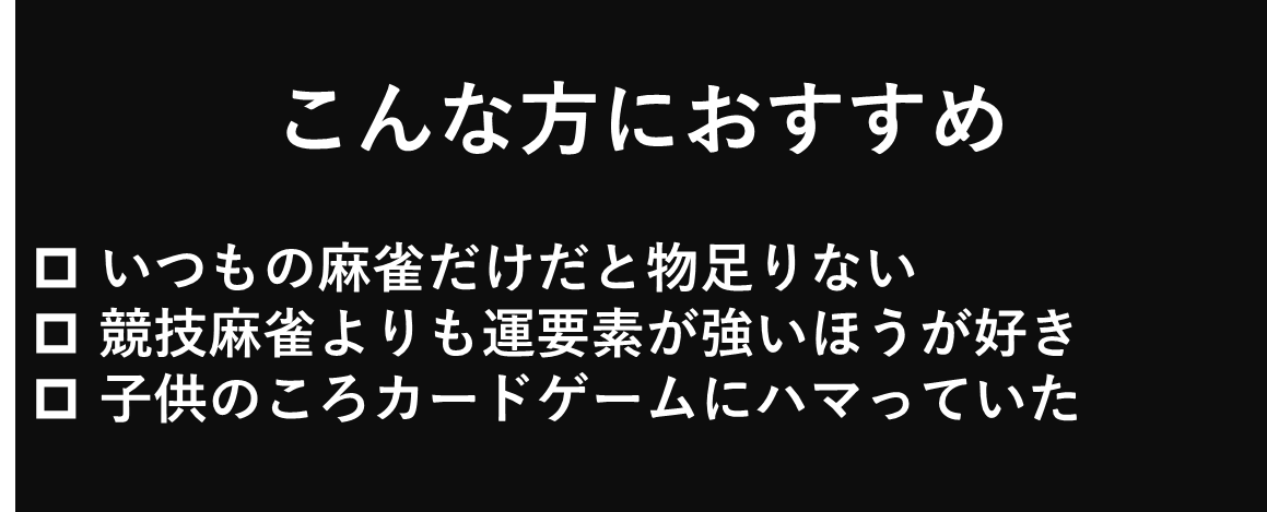 場にモンスターを召喚することでドラを増やしたり、魔法カードで相手の手牌を見たり、相手を鳴けないようにしたり、と誰しもが子供のころに遊んだカードゲームの要素を麻雀に加え、いつもの麻雀が100倍熱く盛り上がるカードゲームとなっておりますので是非遊んでいただければと思います。