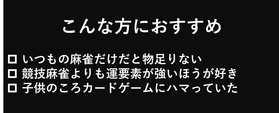 また、本カードには通常の麻雀のルールブックは含まれておりませんので、通常の麻雀のルールをご理解いただいている方向けの商品となります。