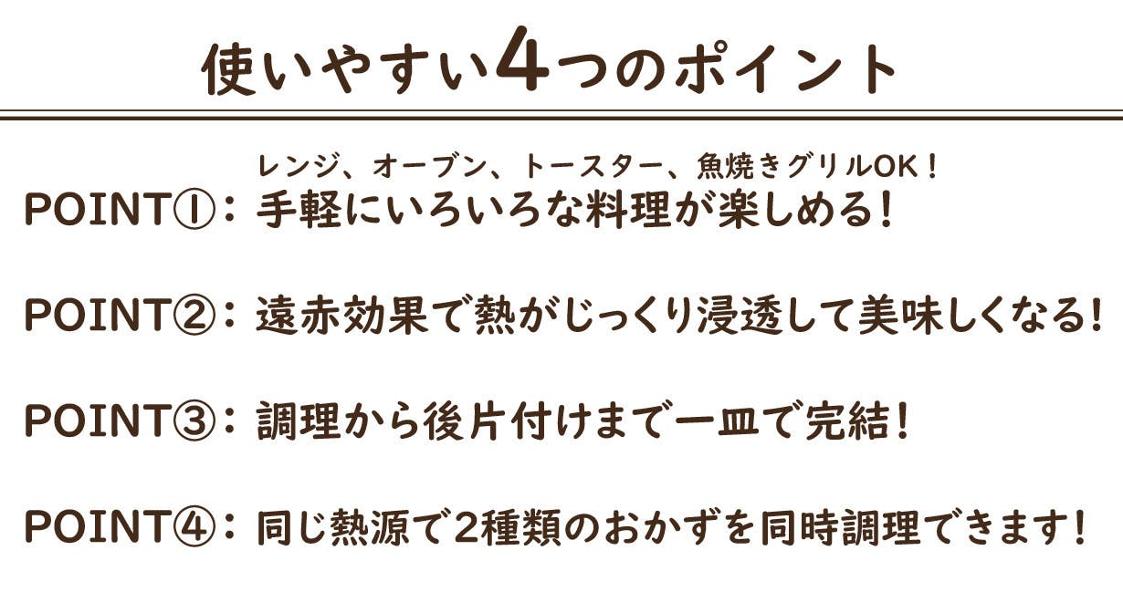 使用できる熱源が多いので、レンジ⇒トースタ―と違う熱源へ移動させて使う事ができます!根菜など固い食材をレンジで下ごしらえしてからグリル調理する事も!お皿を移し替える手間が減るので楽になります。