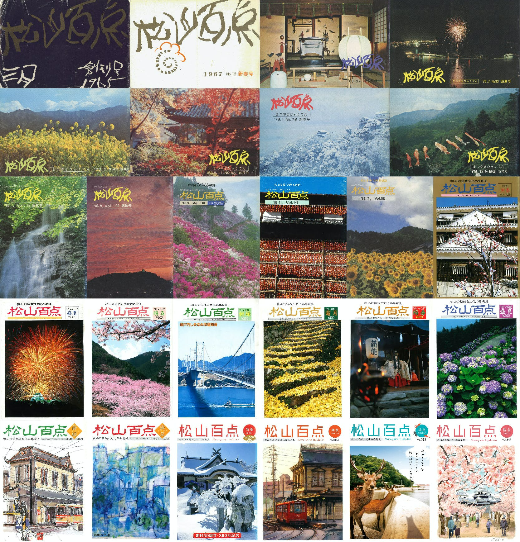 これまで、地元の芸術家やカメラマン、デザイナーの協力のもと、さまざまな表紙デザインが松山百点を彩ってきました。