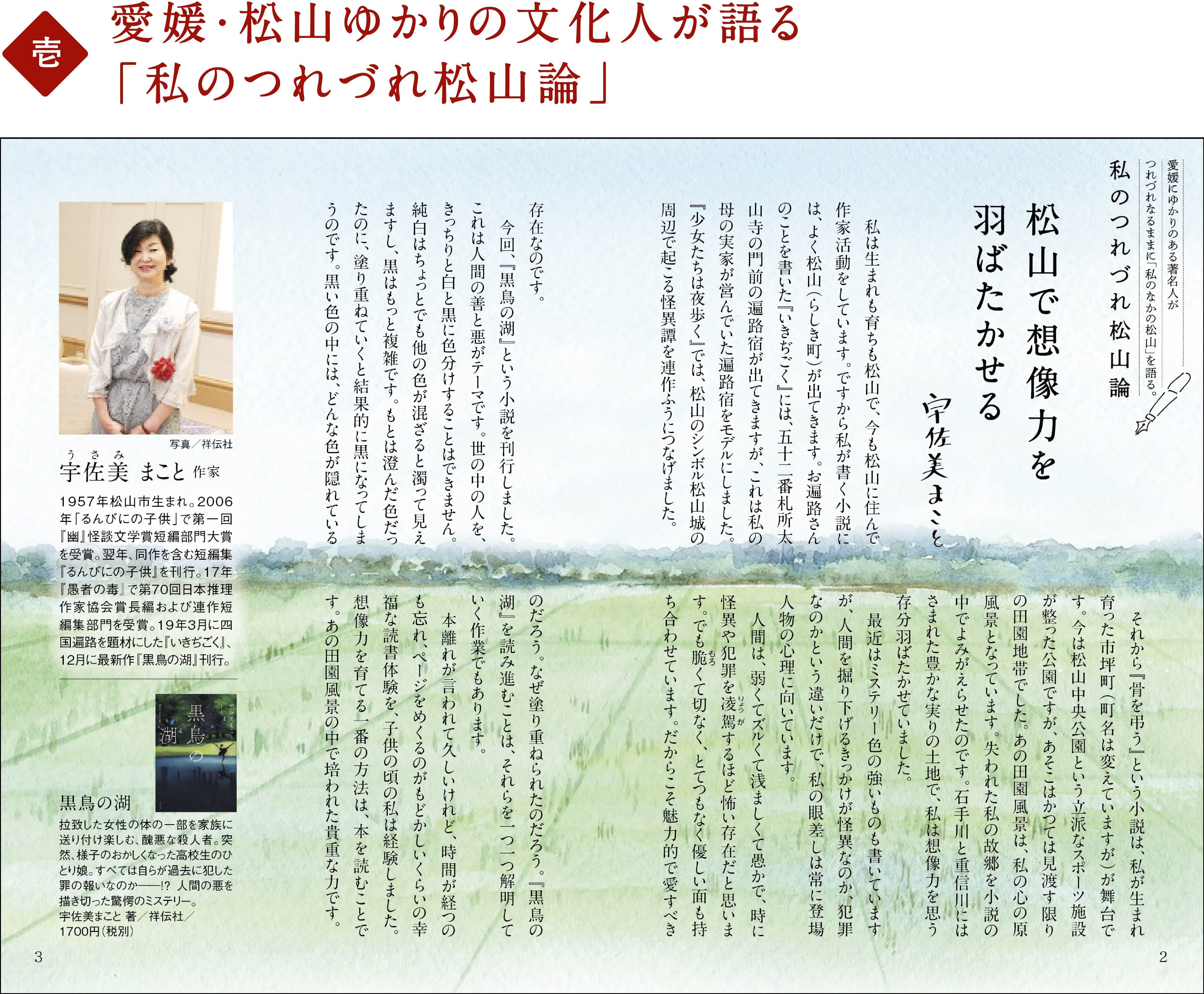 愛媛・松山にゆかりのある著名人・文化人が、つれづれなるままに「私のなかの松山」を語る巻頭を飾るコーナー。