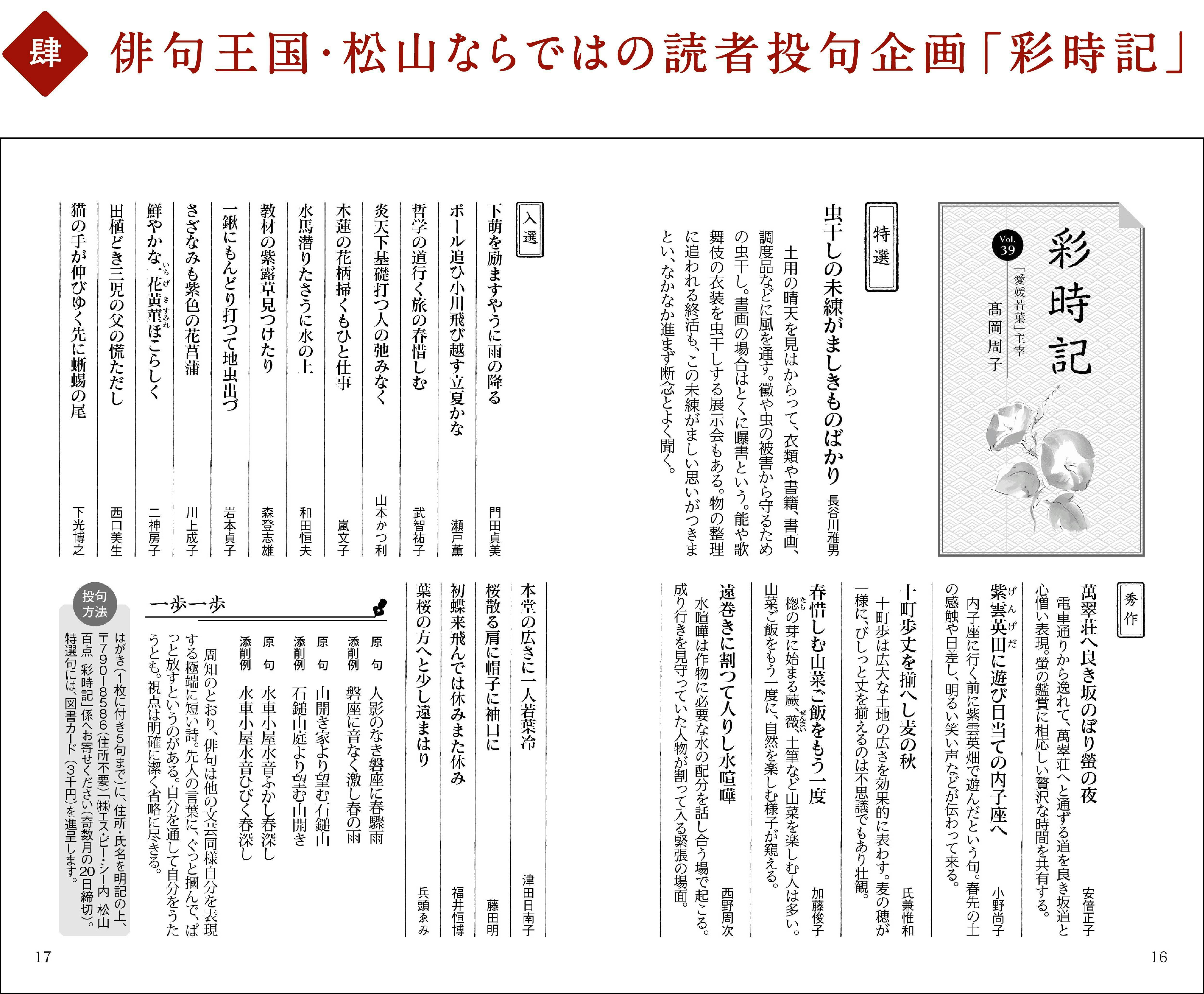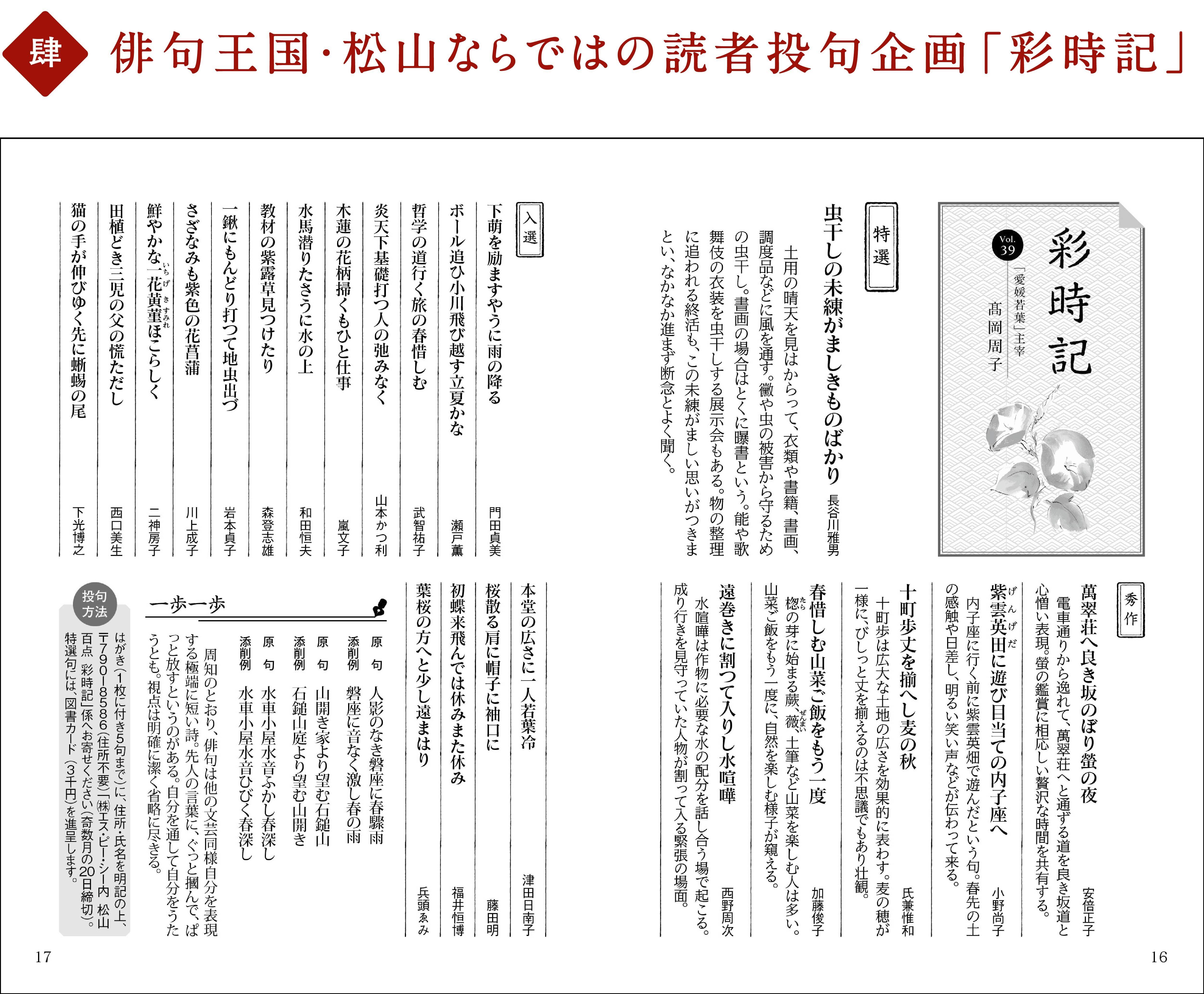 愛媛若葉主宰の高岡周子氏が、読者から寄せられた俳句を選考し、評価を行います。