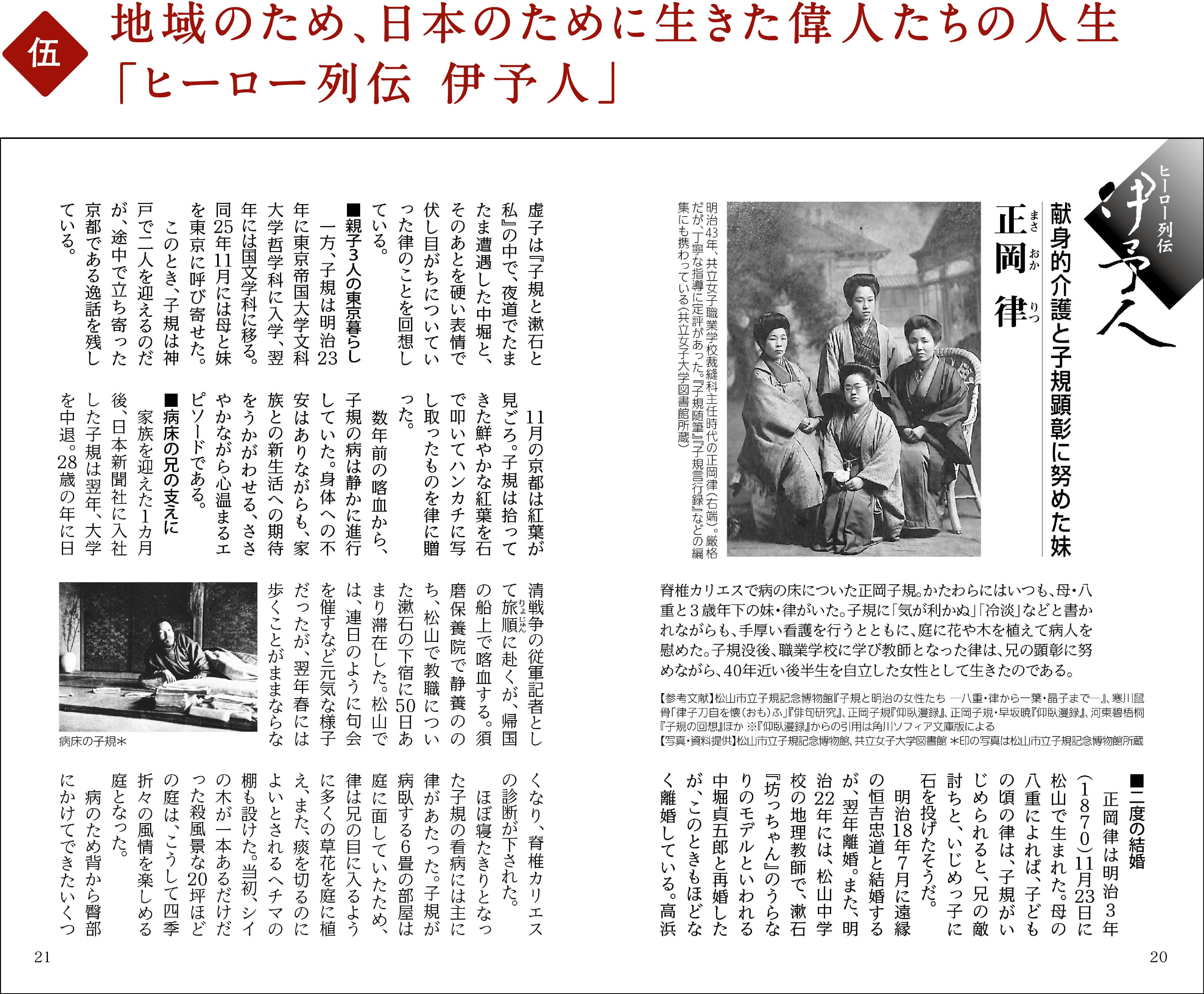 正岡子規はもちろん、その妹で子規を支えた律、逆賊の汚名をかぶりながら松山を守った第14代藩主・松平定昭、松山の大学教育に尽力した語学の天才・八木亀太郎など、江戸期から近・現代まで、全国的に名の知られた偉人から地域の知られざる英雄まで、幅広く紹介しています。