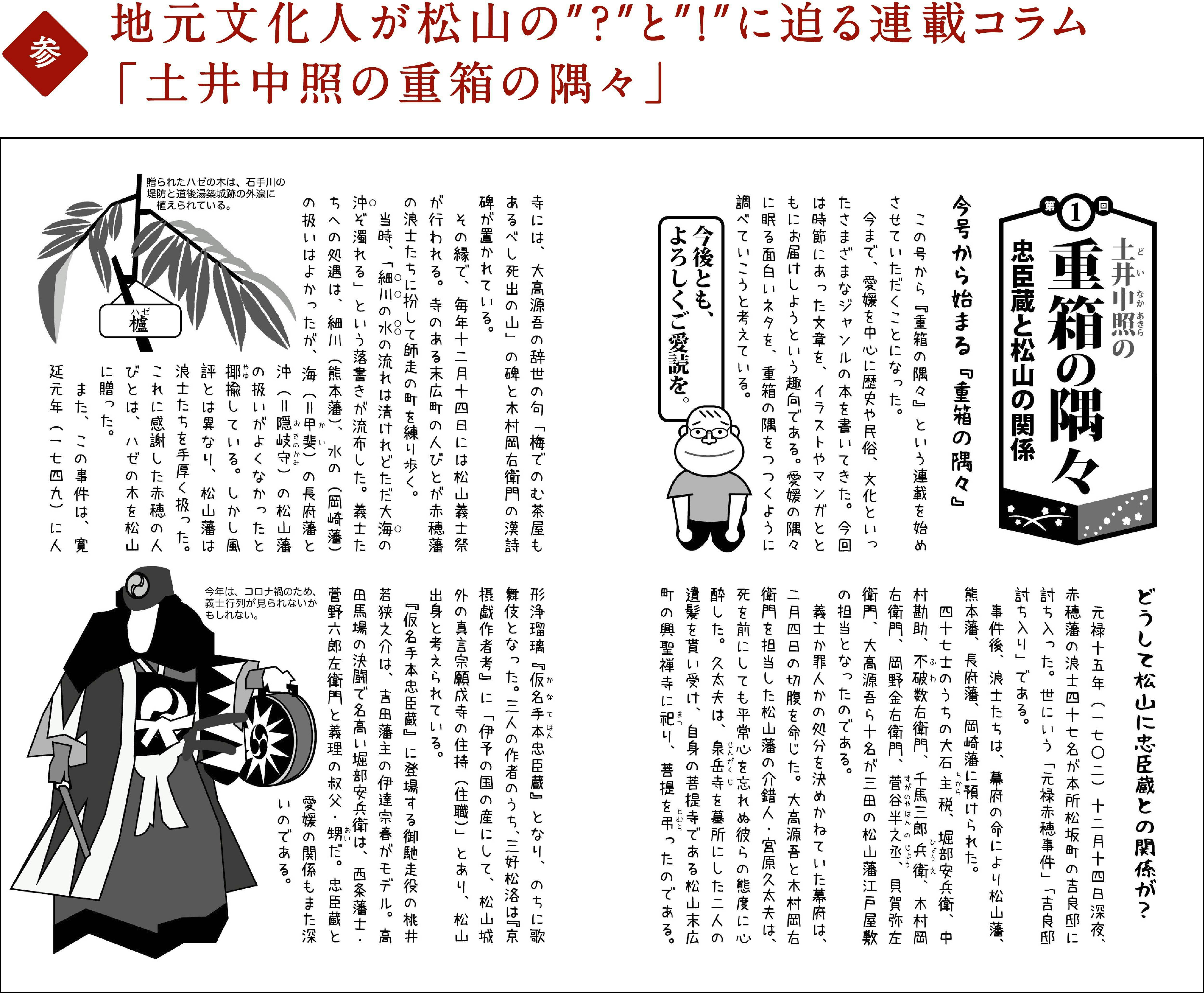 地域によって異なる風習や文化、愛媛ゆかりの偉人たちにまつわる逸話などが独特の語り口調で書き下ろされ、読者から毎号感想が寄せられる人気コーナーです。