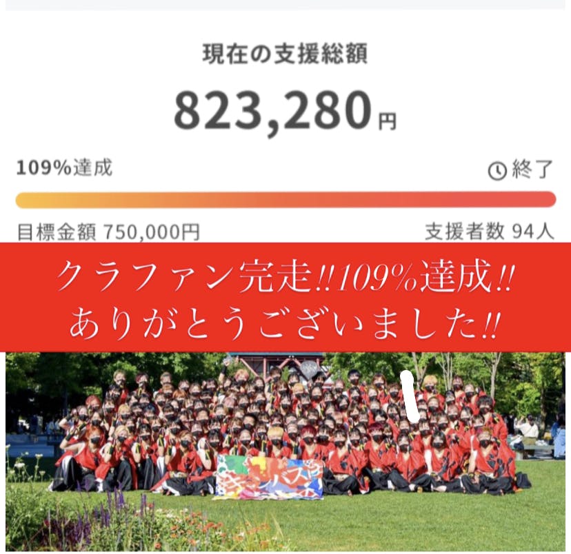 2022/09/02 11:128/31をもって、早稲田大学"踊り侍" 単独公演IXABA開催に向けてのクラウドファンディングを終了いたしました!皆様のお力添えにより、94名の方から【総額823,280円】のご支援をいただき、目標額75万円を109%で達成することができました!本プロジェクトにご支援いただいた皆様、プロジェクト拡散にご協力いただいた皆様、本当にありがとうございました!!何より、コロナ禍入会の私たちが祭りが復活した今に単独公演を開催する、その決断を応援してくださる方々の存在が本当に嬉しく、励みとなりました。IXABA当日、会場で、画面越しで、今に全力になる私達の姿をお伝えできることを心待ちにしております!IXABA開催まで残り27日。皆様からのご声援にお応えし、更にはご期待を超えられるよう、早稲田大学"踊り侍一同突っ走って参ります。随時SNSにて『IXABA』の情報を発信して参りますので、チェックしていただければと思います!今後ともご指導・ご声援のほど何卒よろしくお願いいたします。 もっと見る