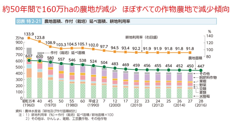 それに伴い、農地も約50年で16000平方キロメートルも減少しています。