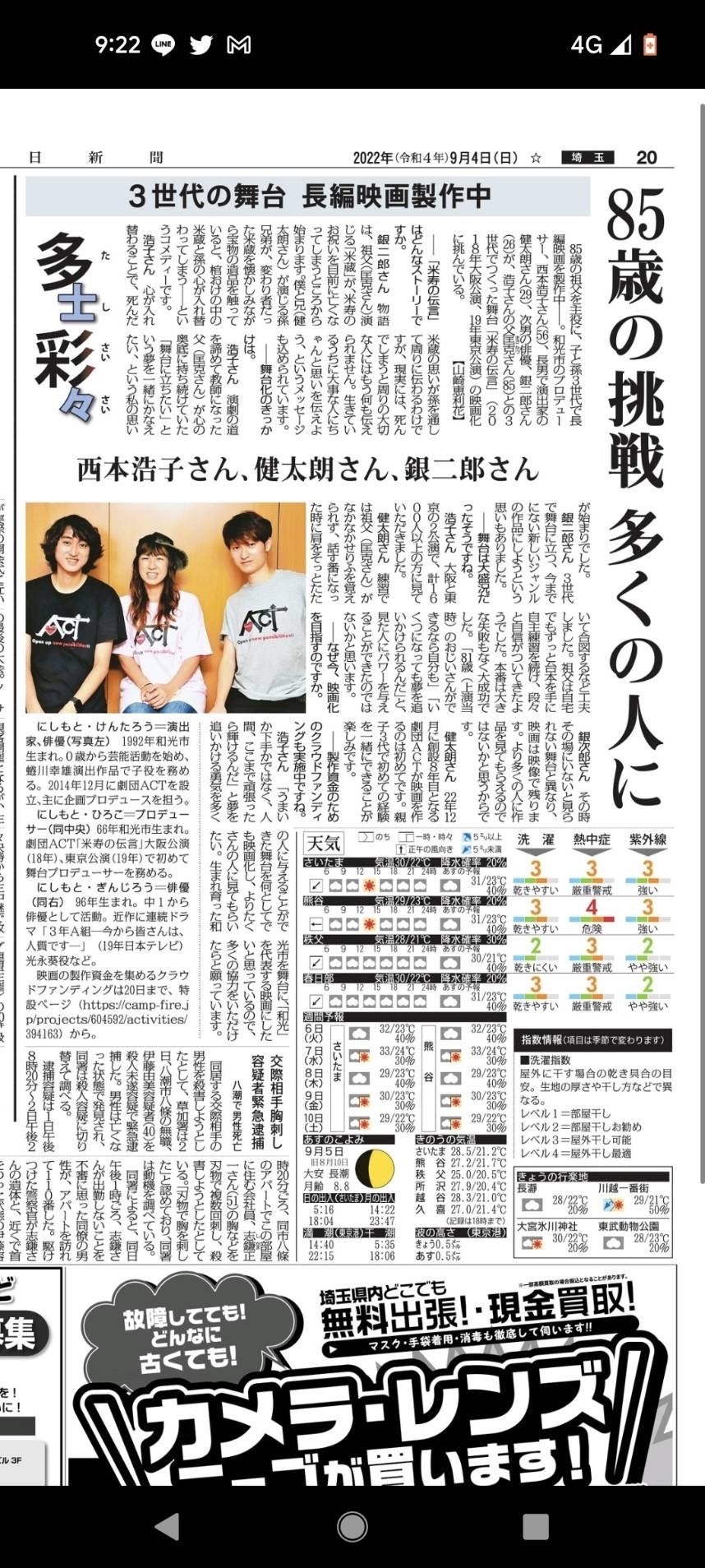 こんなに大きく載せてもらいました。毎日新聞朝刊です。新聞に載せてもらったのなんて初めてだわ♪───O(≧∇≦)O────♪一生の宝物になりました。色々な経験をさせてもらいありがとうございます。『米寿の伝言』プロデューサー 西本浩子