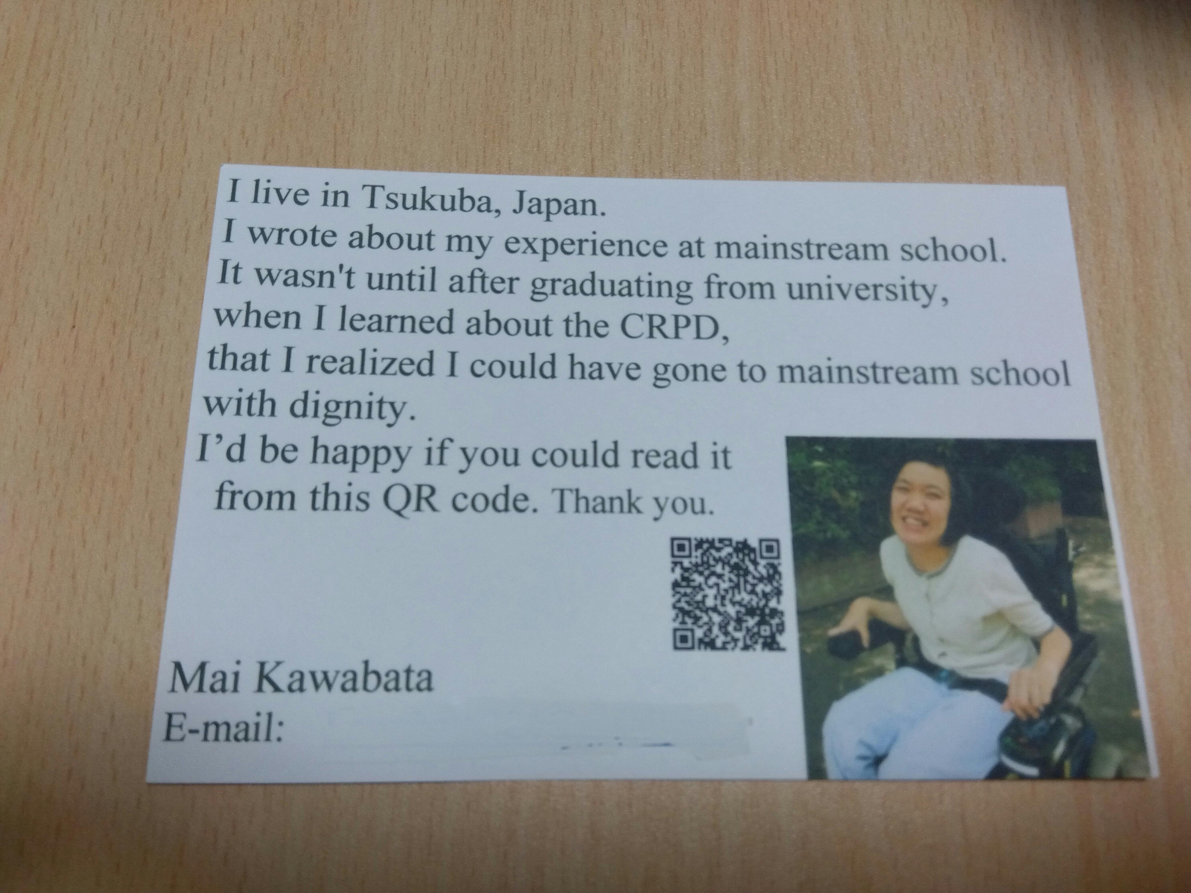 国連で審査委員の方にお渡しする予定のカード!できました。カードのQRコードを読み込むと、クラウドファンディングの本文に書いた、私のこれまでの経験が英語で読めます。