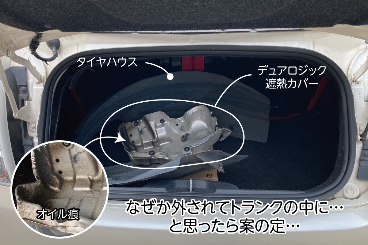 調べると自動変速機(デュアロジック)から漏れている。しかも左前タイヤハウスカバーとデュアロジック遮熱カバー(オイル漏れ痕あり)を外してトランクに入れているという、わかってて黙ってたのがわかりすぎる確信犯。
