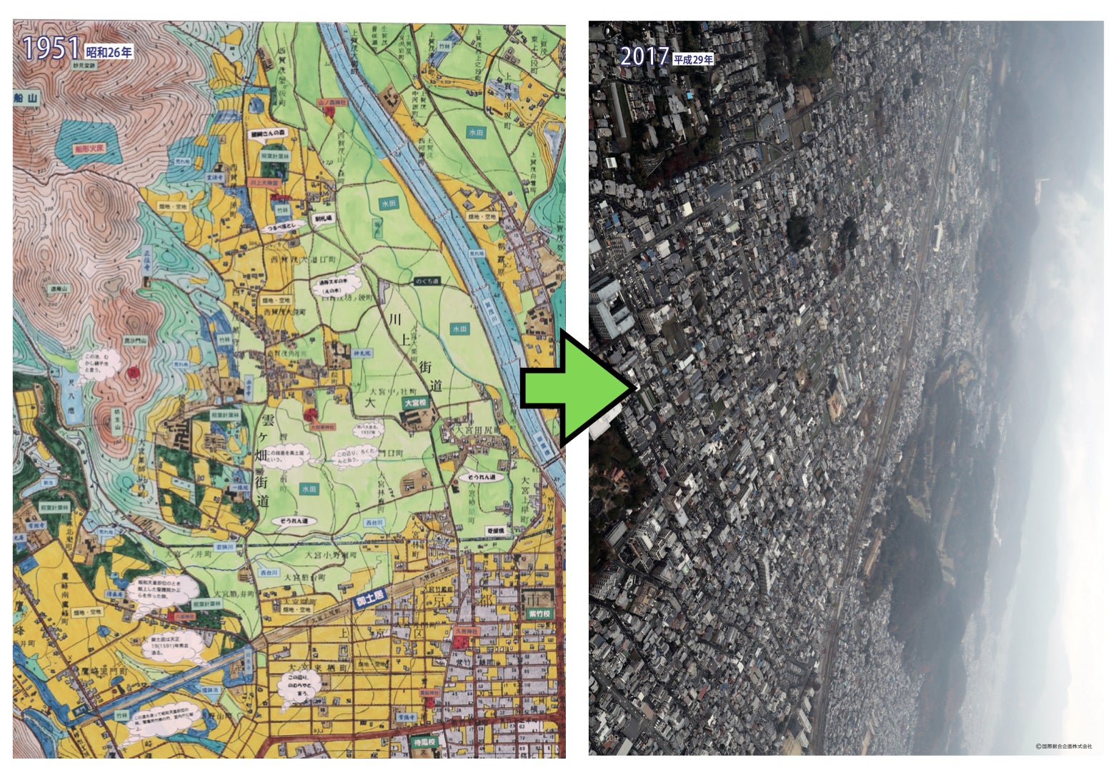 大宮学区は、京都市北区の中央部に位置する人口約17,000人、世帯数約7,600世帯、面積約10平方km、自然や農地が残る地域です。1964〜66(昭和39〜41)年にかけての2度にわたる区画整理事業が行われました。それらにより農村風景の多くが失われ、宅地化、人口増加がすすみました(下の左写真は1951年の大宮学区。緑色の部分は農地。右写真は2017年のもの。かつて農地だったところの大部分は住宅地に変わりました)。