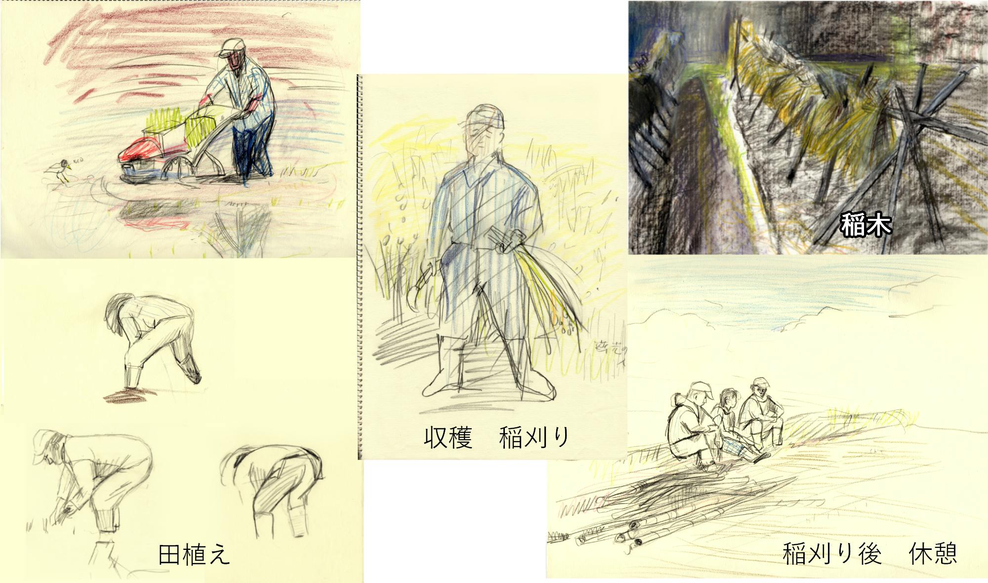 さまざまな方の聞き取りから始めましたが、具体的に絵にするのに、小学生の保護者でもある日本画家の由佳さんが「地域のために私のできることで役に立ちたい」と手を挙げてくださいました。以来あらゆる機会に出かけてスケッチを集め、下絵にまでまとめてくださいました。