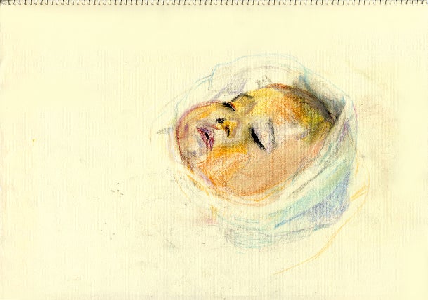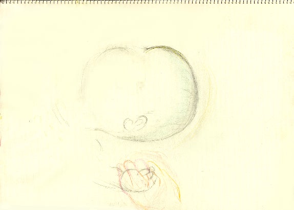 このスケッチは、息子の記憶を失っていく苦しみに涙を流しながら息子の頭をなでるように描き、息子の手を握るように手を描いた。なんとか思い出せないかと希望を持ちながら。