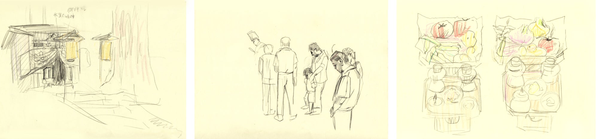 7軒の家が氷室神社を守っている。そのうちの一軒に子どもが生まれたことで、子どものお祭りの『地蔵盆』が復活した。子どもがいなくなると地域のお祭りが存続できない。私の故郷も少子化で秋祭りの獅子舞が出来なくなった。実際にスケッチに行くことで地域の人の祭りを守る想いが伝わりました。