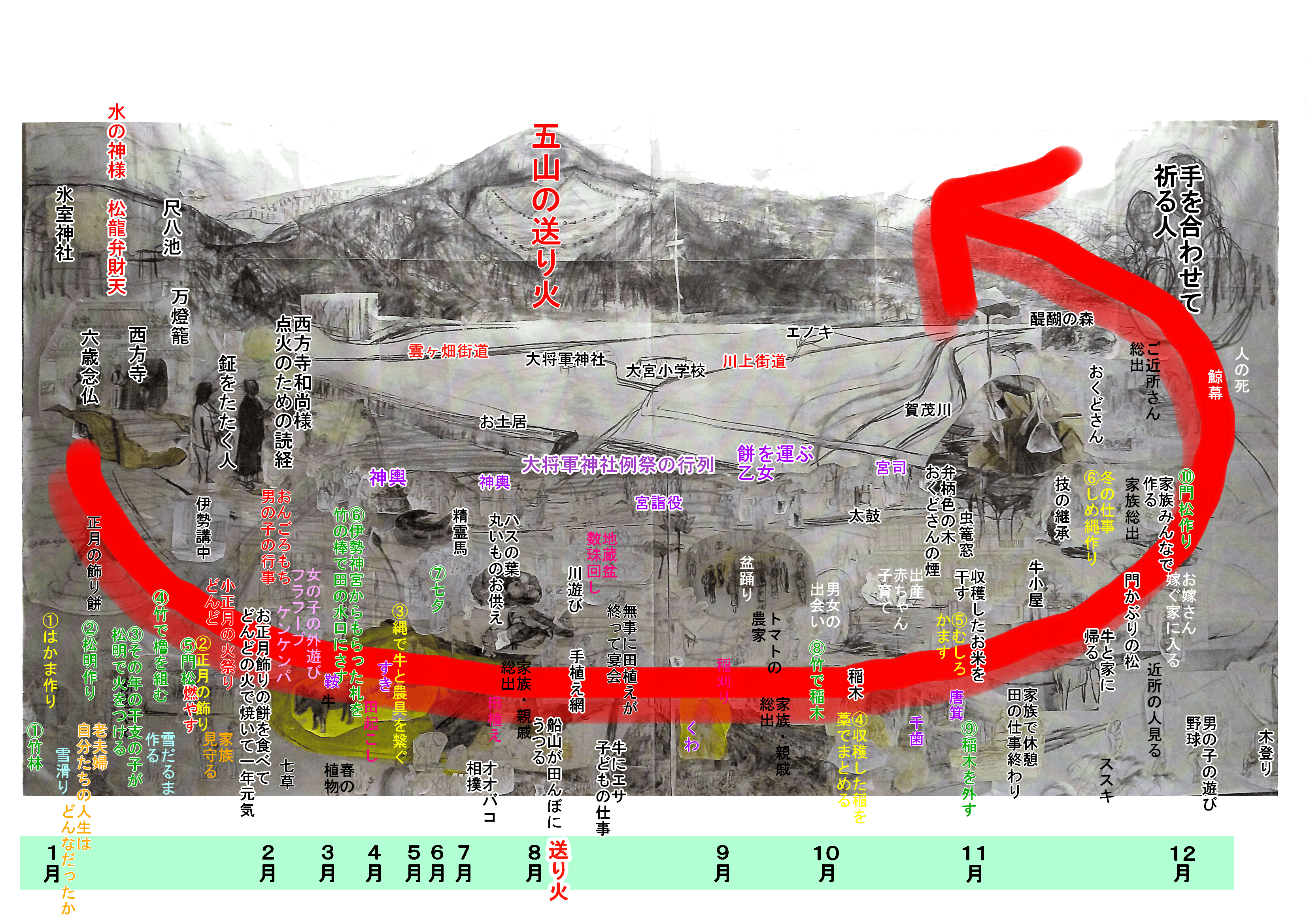 絵図の一番左は1月、一番右は12月として時間を設定して月日を表現。