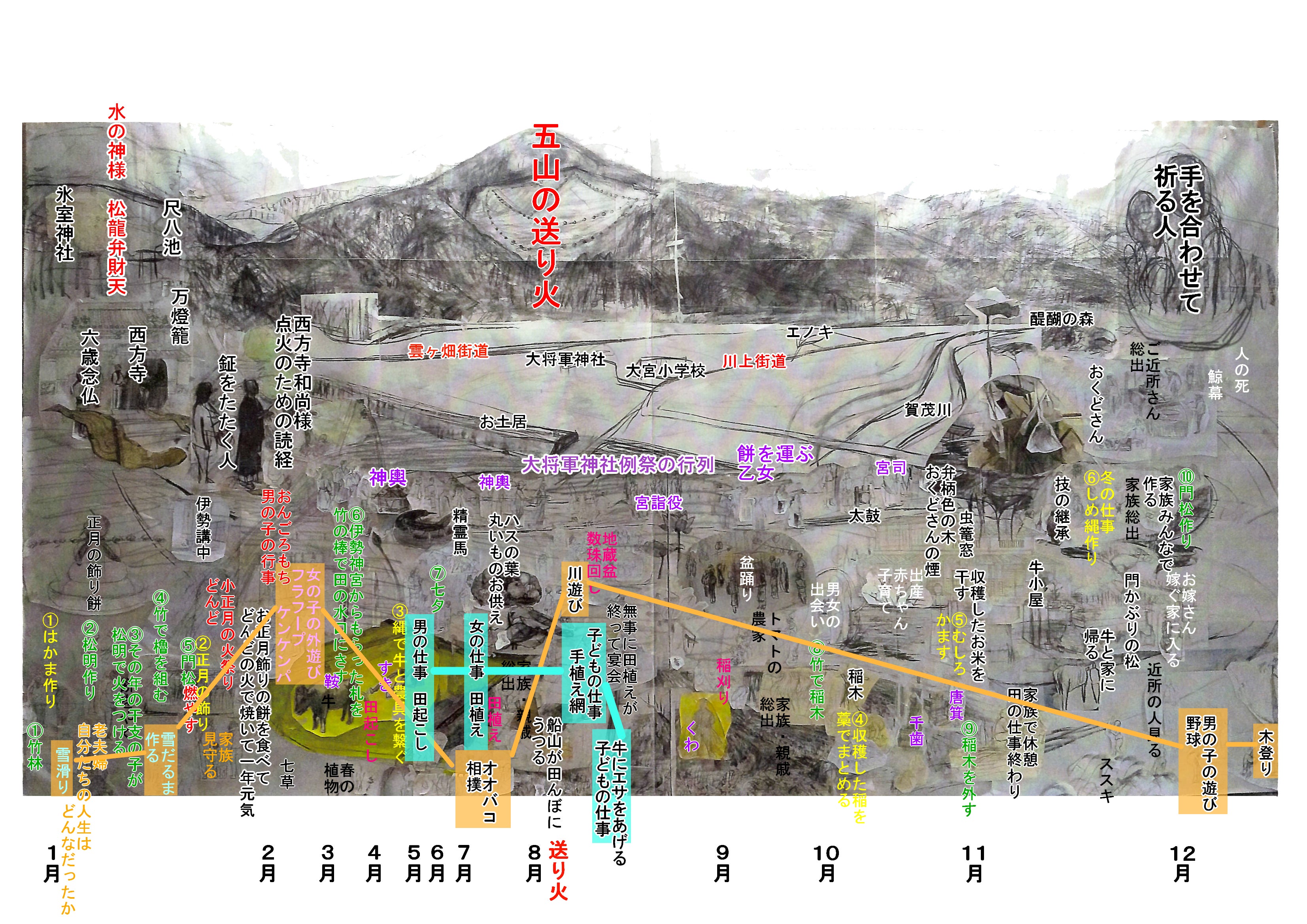 下絵の中の水色の線はそれぞれの仕事を表現