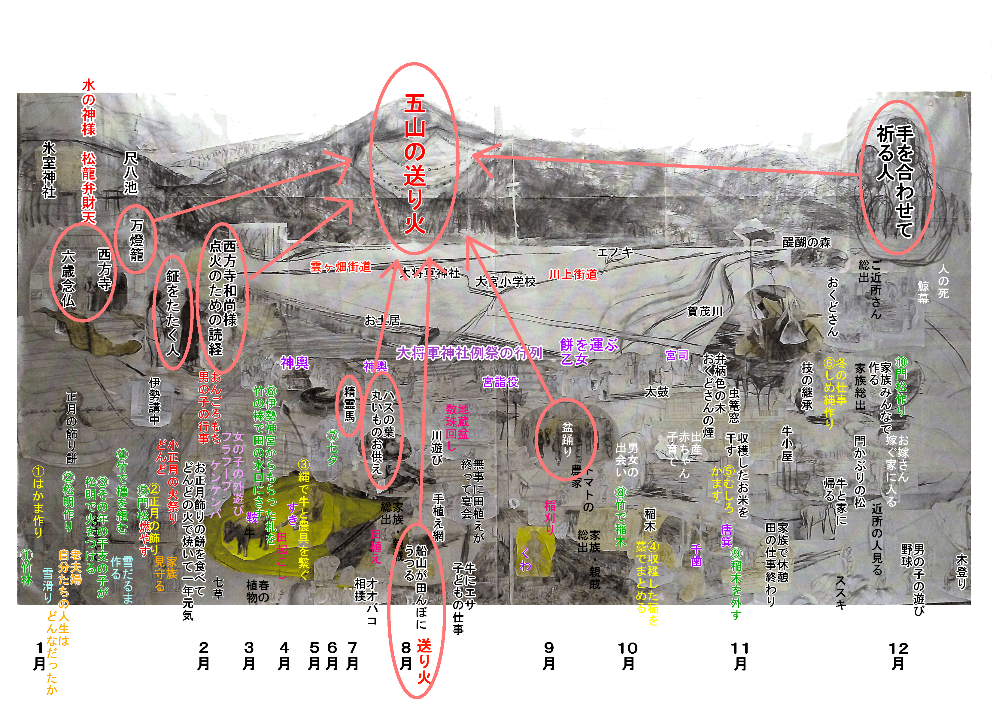 下絵には、『五山の送り火』に対して関係しているものに『赤丸』がしてあります。