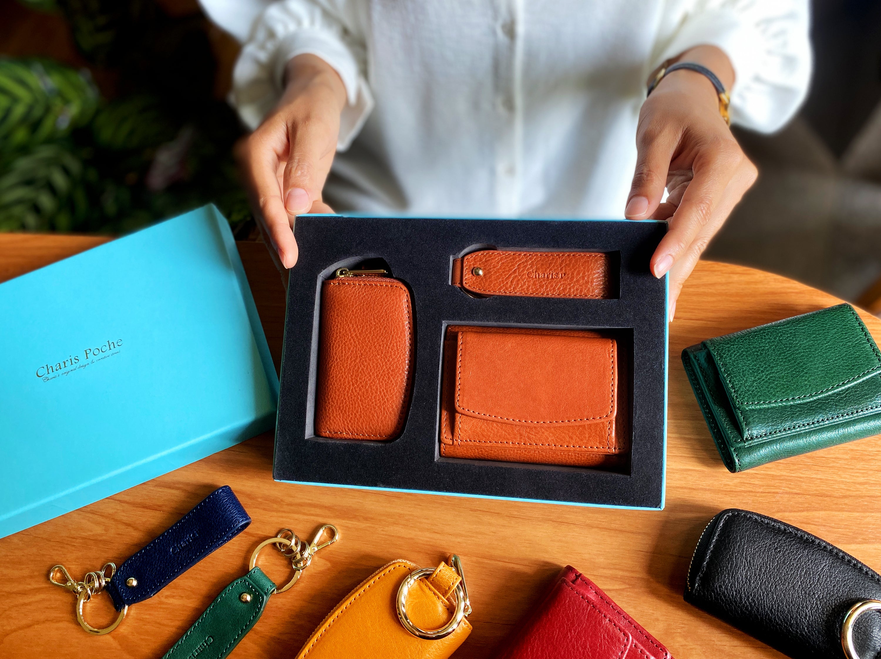 イタリア製の本革を使用した洗練された“大人”な印象のスマートキーケースとスリムなキーホルダー。同じカラバリ・フォルムでデザインされた化粧箱付き3点セットです。男性・女性問わずプレゼントにも喜ばれます♪