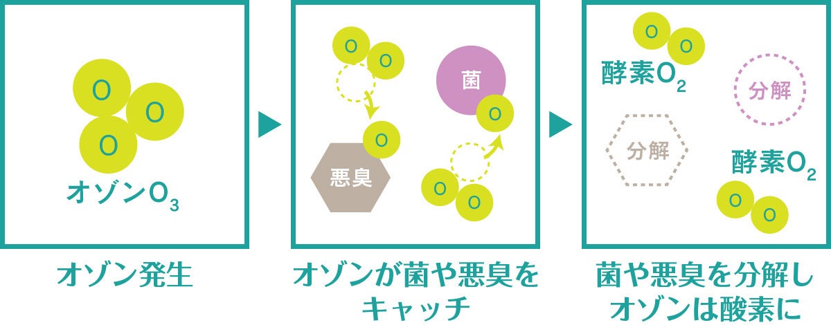 オゾンは空気中の菌やにおい物質と融合し分解、オゾン自体は酸素に戻るため、2次公害の心配はありません。薬剤などを使用していないので、除菌効果が変わらず、耐性菌もできません。
