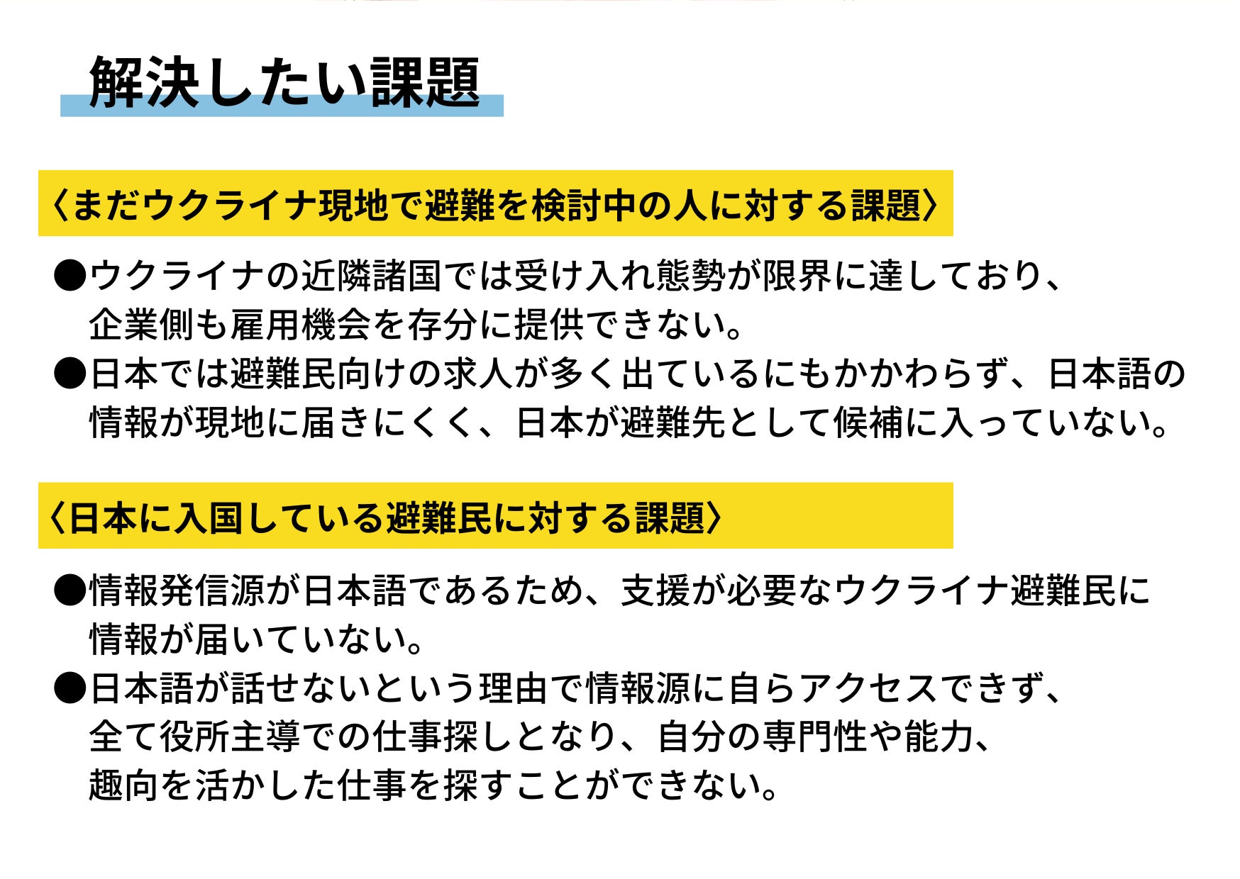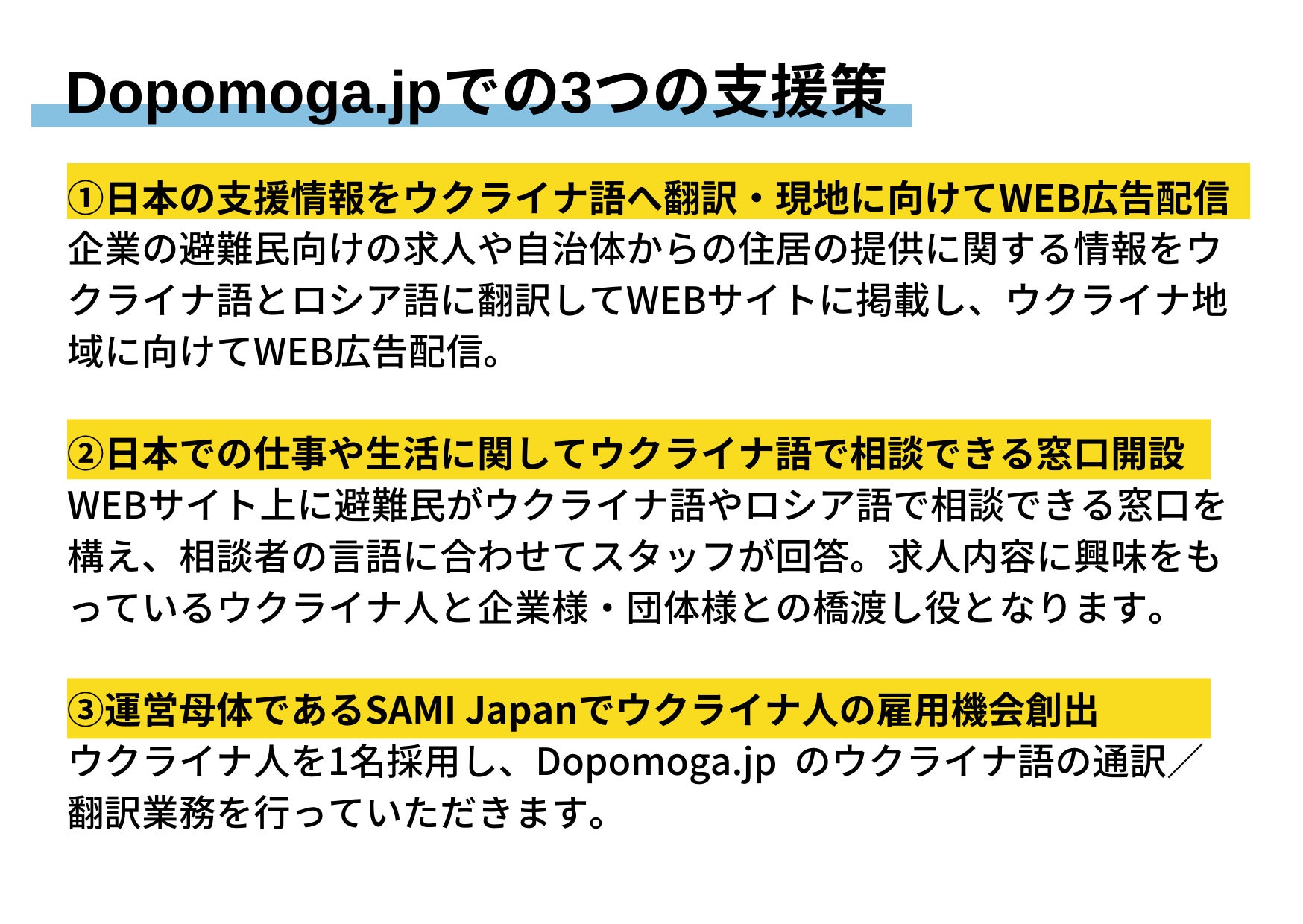これにより、現地で避難を踏みとどまっている人に対して日本という選択肢が開かれることで救える命があると思いますし、既に避難してきた人も日本での支援情報に触れやすくなります。さらに、3つ目の支援策として、Dopomoga.jpを運営すること自体がウクライナ人の雇用機会となることを目指し、